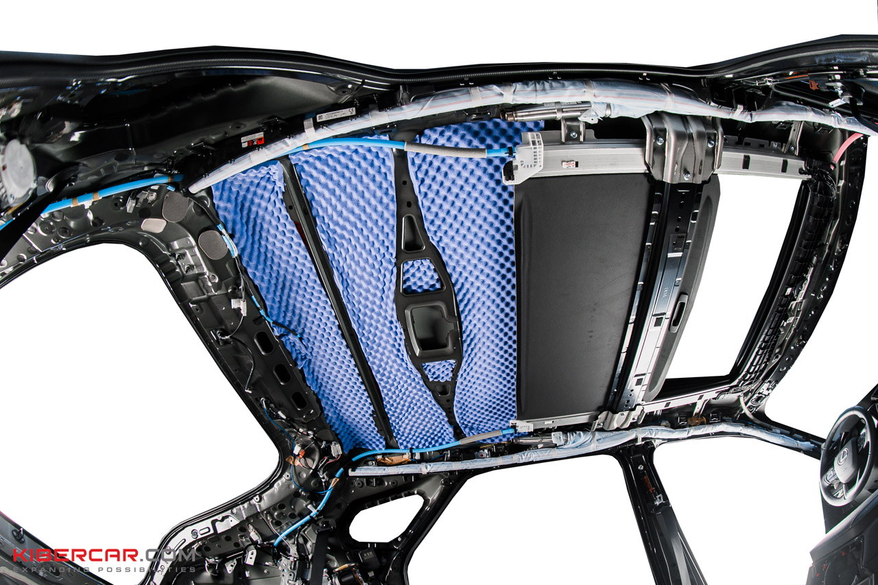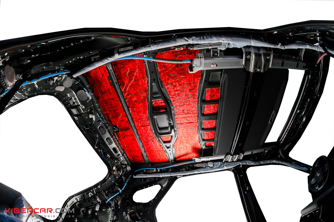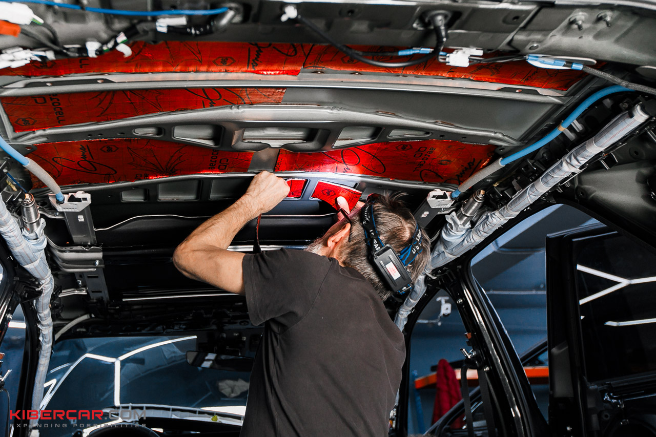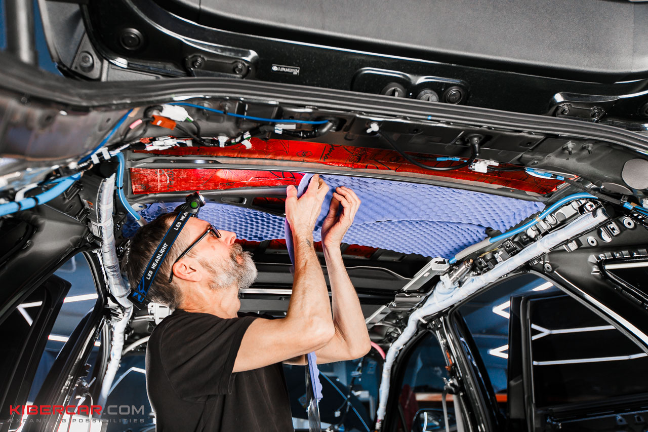Следующий этап – шумоизоляция крыши. Максимально аккуратно чистыми одноразовыми перчатками демонтируем потолочную обшивку и обезжириваем поверхность потолка. После предварительной подготовки приступаем к шумоизоляции.