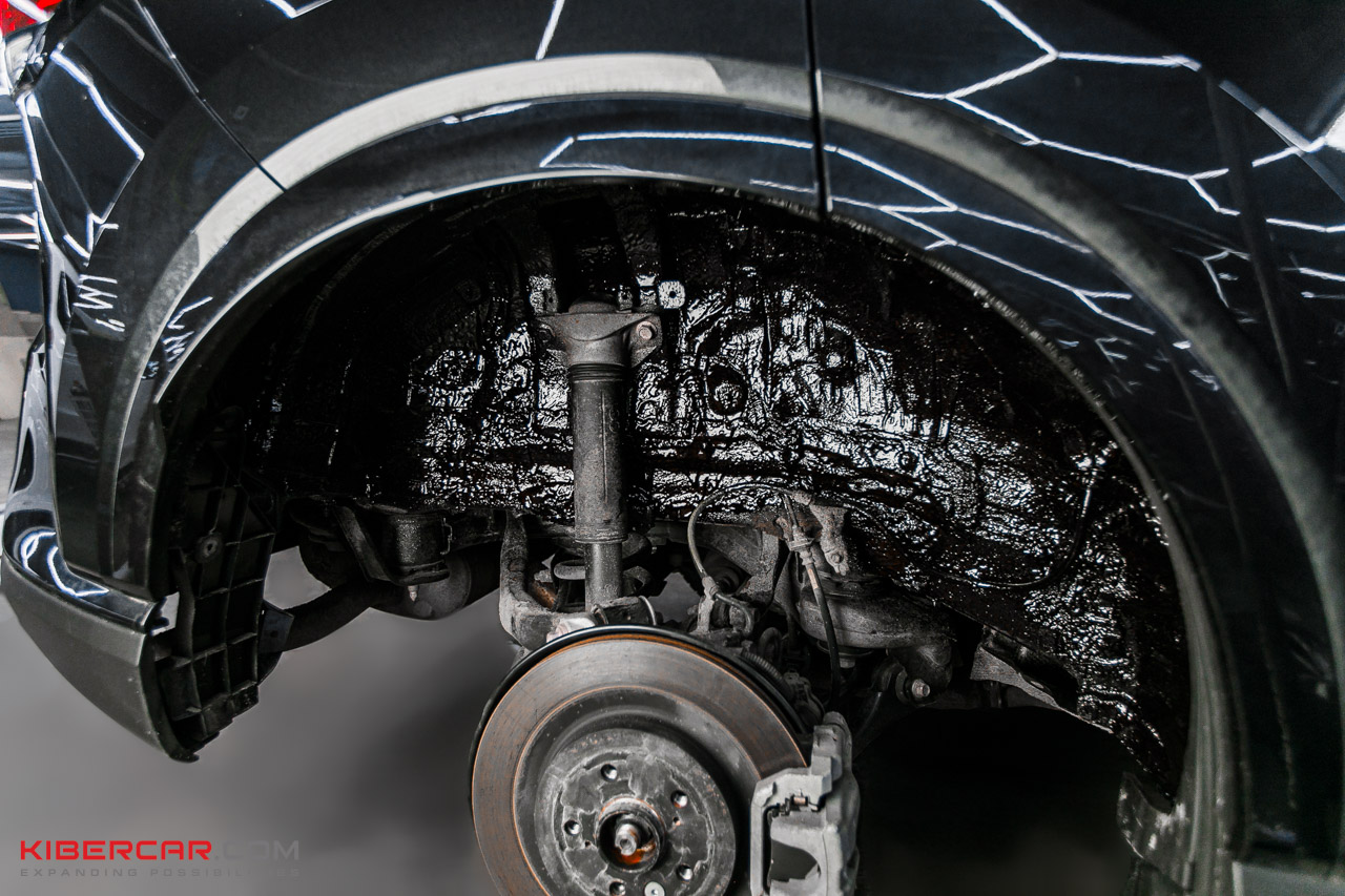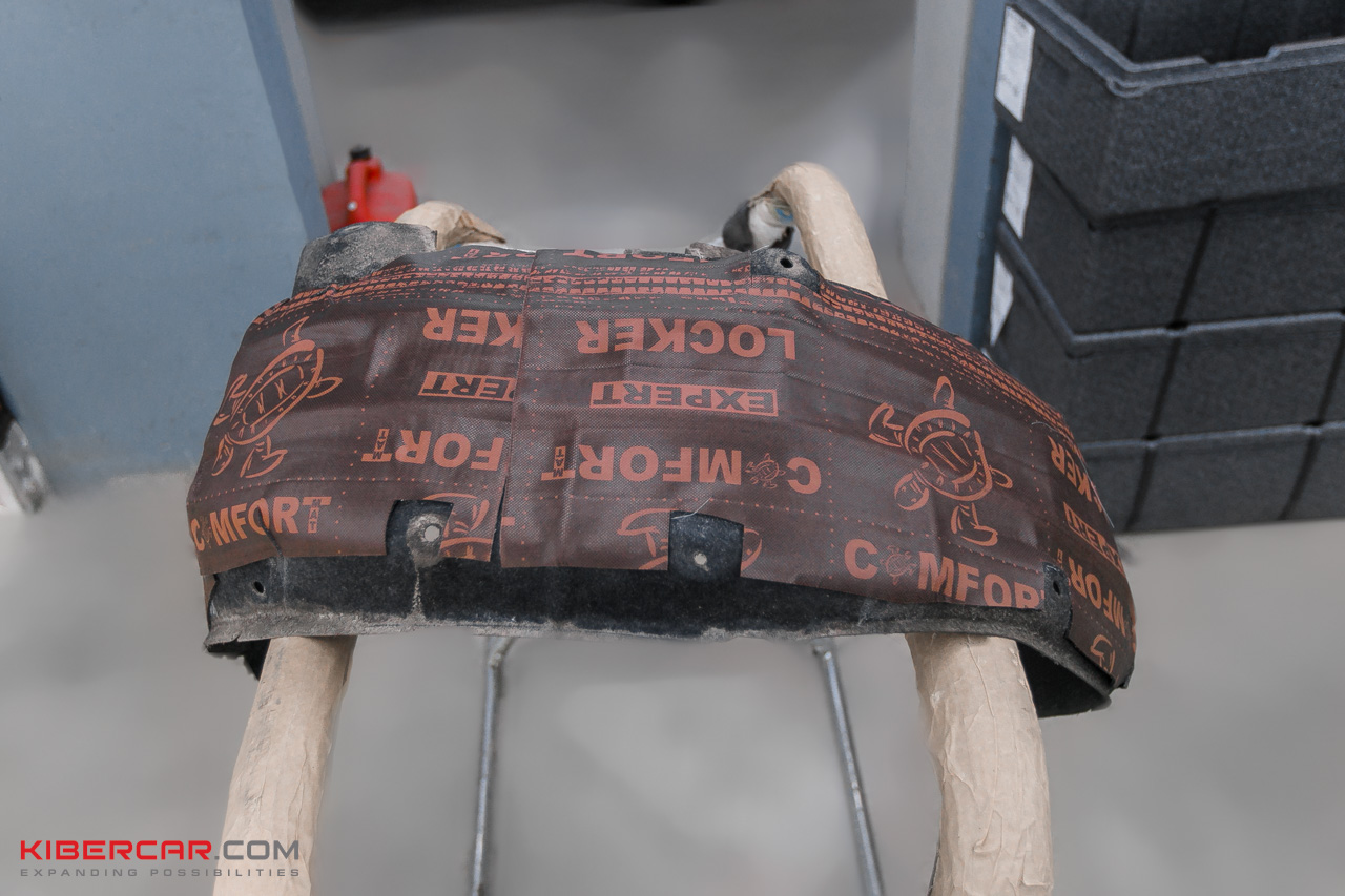 Финальным этапом шумоизоляции будет шумоизоляция колесных арок. Это позволит нам существенно усилить эффект снижения шума, издаваемого резиной автомобиля. Сначала снимаем 4 подкрылка, обезжириваем их поверхность и наносим следующие слои.