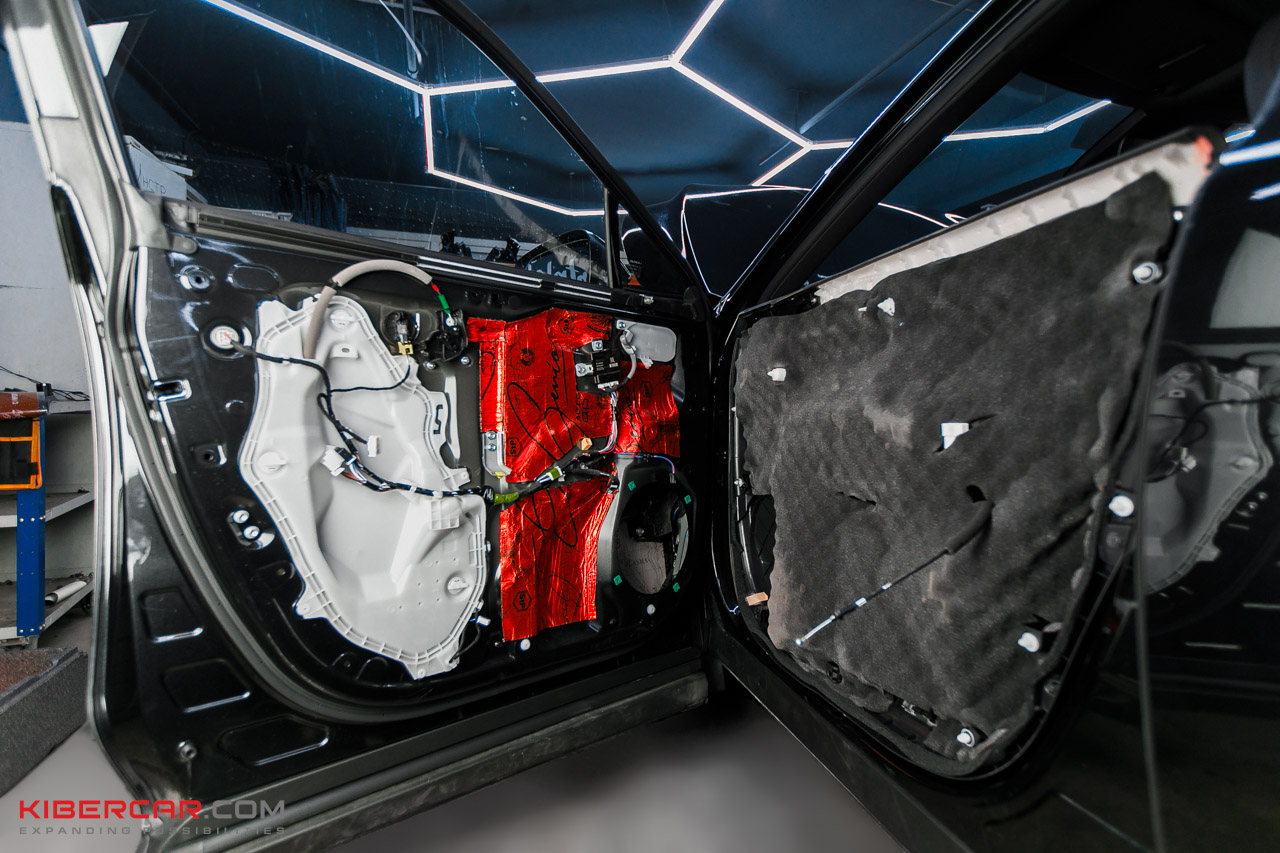 Работы по шумоизоляции начинаем с дверей. Максимально аккуратно разбираем дверные обшивки. После этого подготавливаем поверхность и обезжириваем все участки и наносим первый слой: