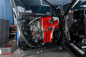 Заключительным слоем используем шумопоглощающий материал последнего поколения – пенополиуретановую пенорезину StP Biplast Premium (15 мм) с увеличенным коэффициентом шумопоглощения, который окончательно задерживает посторонние шумы. Этот же материал, выступает в роли антискрипа. Наносим его на карты дверей.