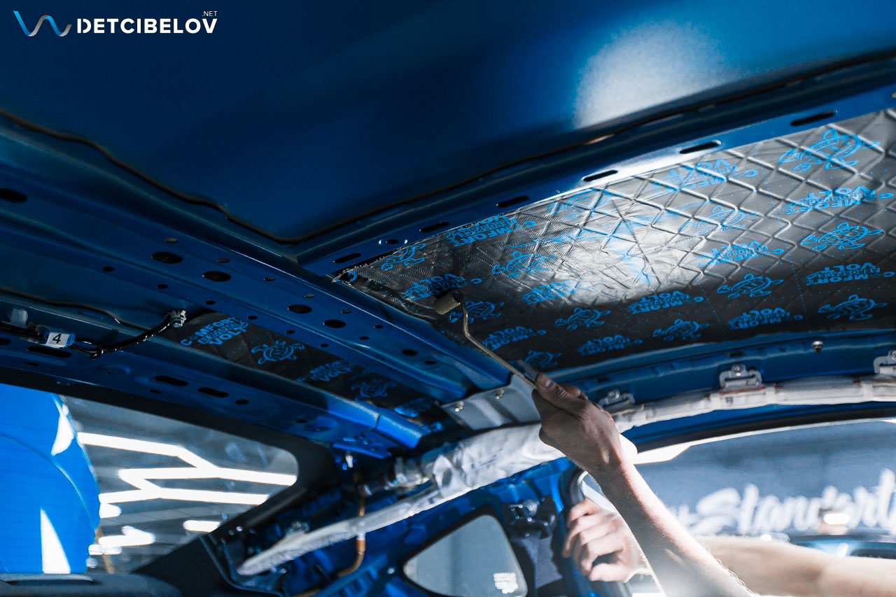 Следующий этап – шумоизоляция крыши. Максимально аккуратно чистыми одноразовыми перчатками демонтируем потолочную обшивку и обезжириваем поверхность потолка. После предварительной подготовки приступаем к шумоизоляции.
