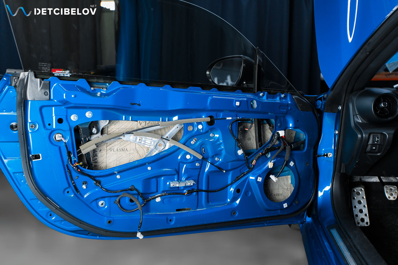 Работы по шумоизоляции начинаем с дверей. Максимально аккуратно разбираем дверные обшивки. После этого подготавливаем поверхность и обезжириваем все участки и наносим первый слой: