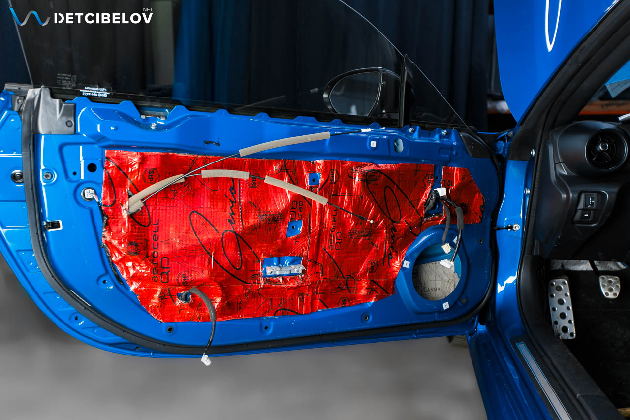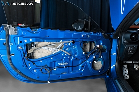 Заключительным слоем используем шумопоглощающий материал последнего поколения – пенополиуретановую пенорезину StP Biplast Premium (15 мм) с увеличенным коэффициентом шумопоглощения, который окончательно задерживает посторонние шумы. Этот же материал, выступает в роли антискрипа. Наносим его на карты дверей.