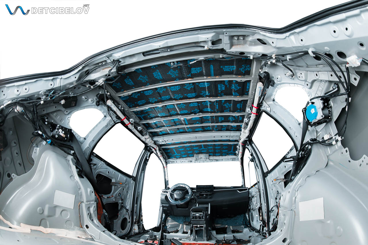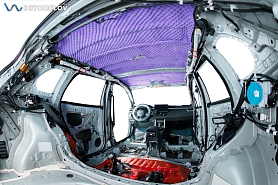 Следующий этап – шумоизоляция крыши. Максимально аккуратно чистыми одноразовыми перчатками демонтируем потолочную обшивку и обезжириваем поверхность потолка. После предварительной подготовки приступаем к шумоизоляции.