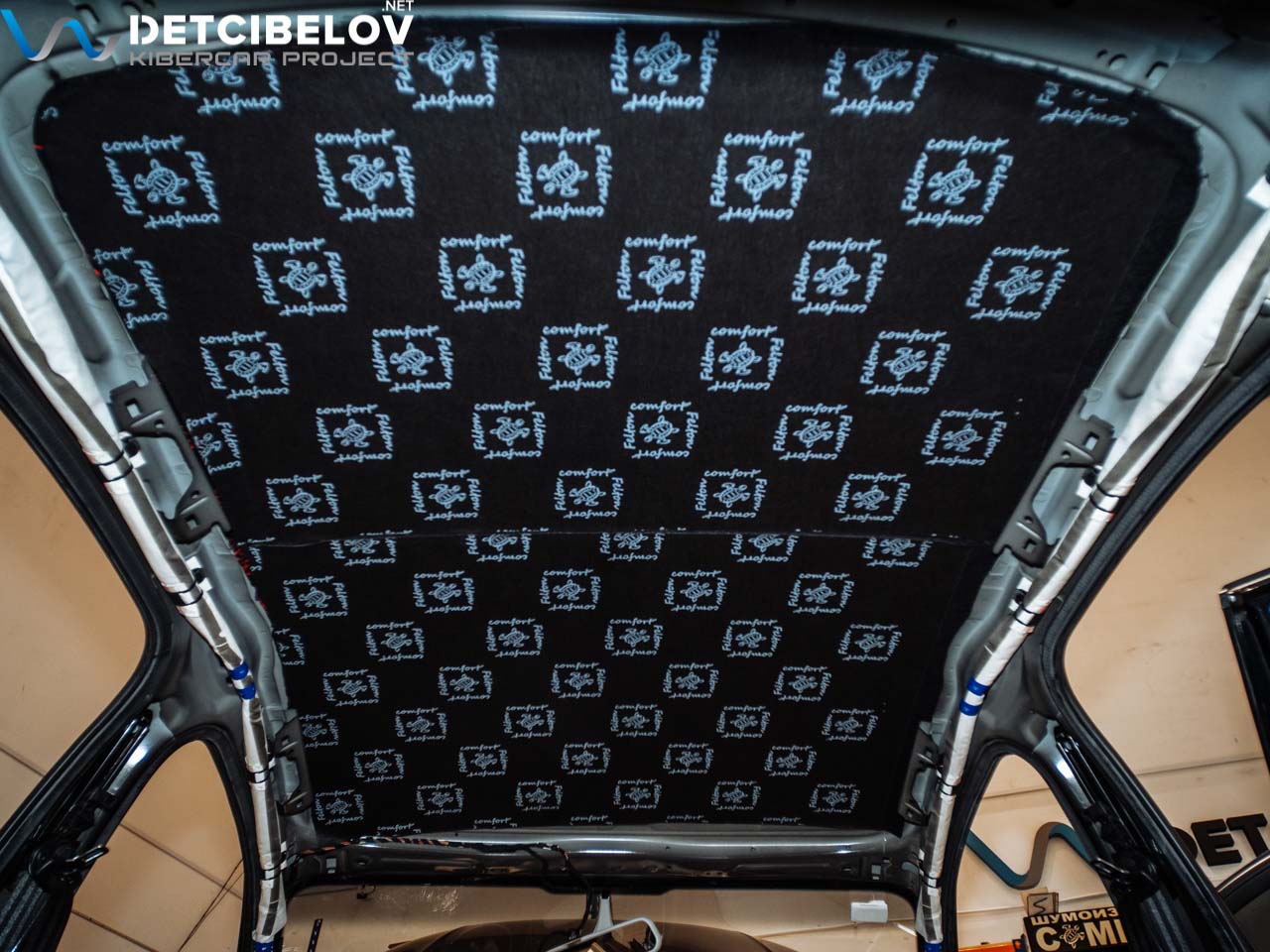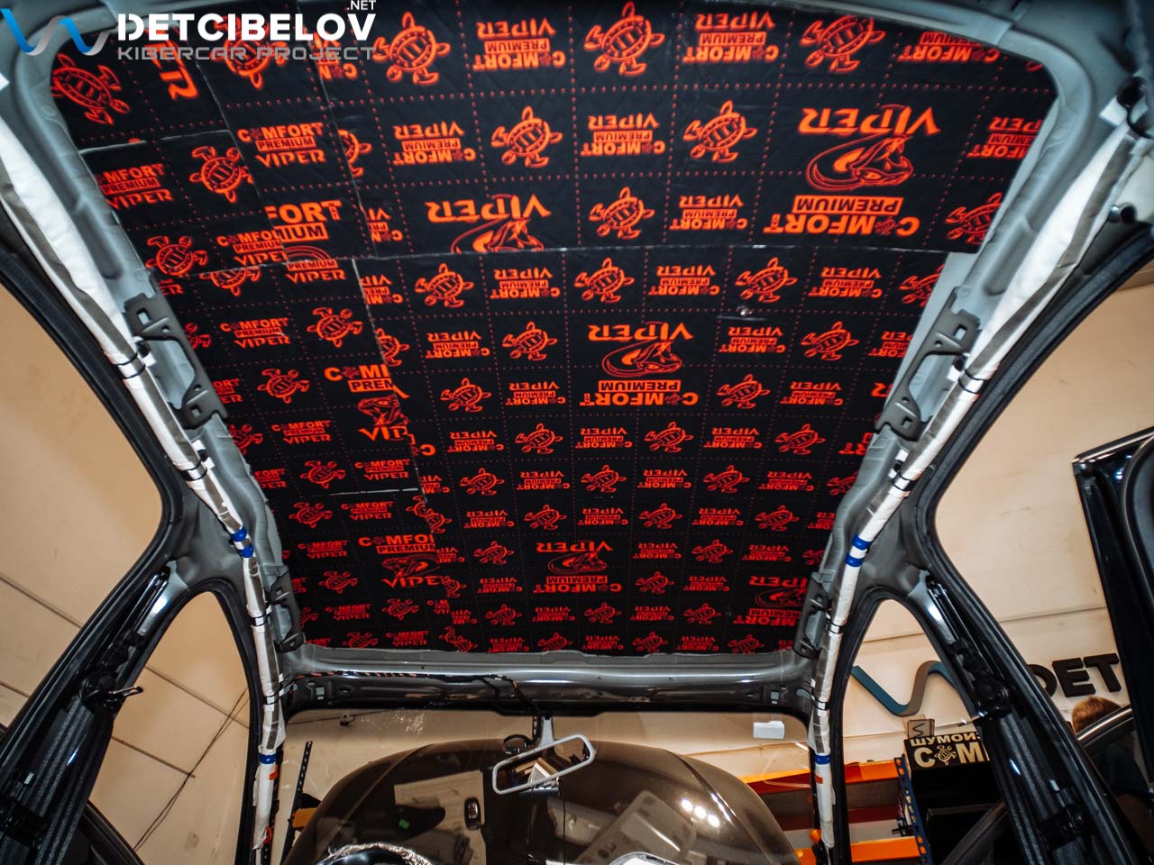 Чтобы снизить амплитуду колебаний на крыше и свести их к минимуму, используем ультралегкий вибродемпфирующий материал премиального уровня Comfort mat Viper. Материал толщиной 3 мм демонстрирует прекрасную адгезию и прекрасно гасит вибрации. Вибродемпфером покрываем всю поверхность потолка.