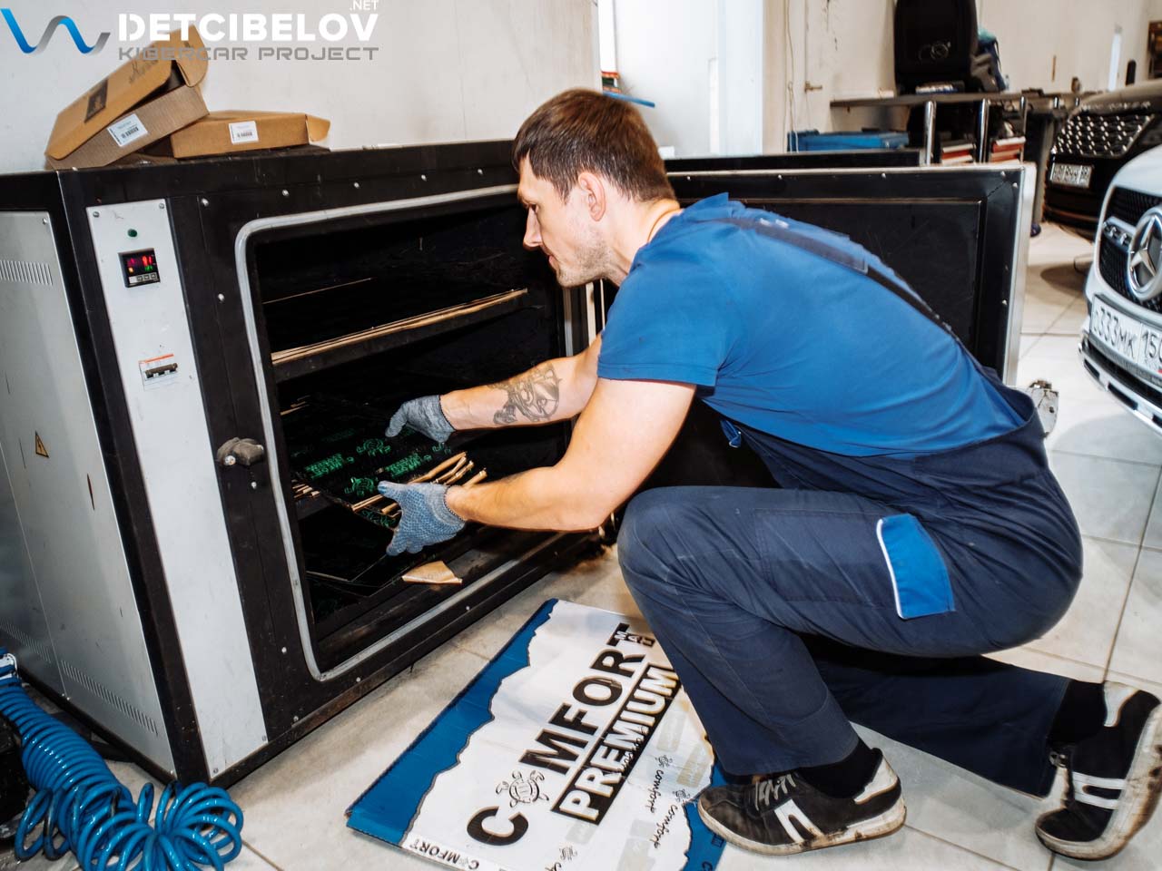 На этом этапе также подготавливаем материалы: проводим расчеты, вырезаем шумо- и виброизоляцию, при необходимости – нагреваем до высокой температуры, используя специальные печи. Предварительный разогрев шумоизоляции упрощает монтаж и повышает его качество.