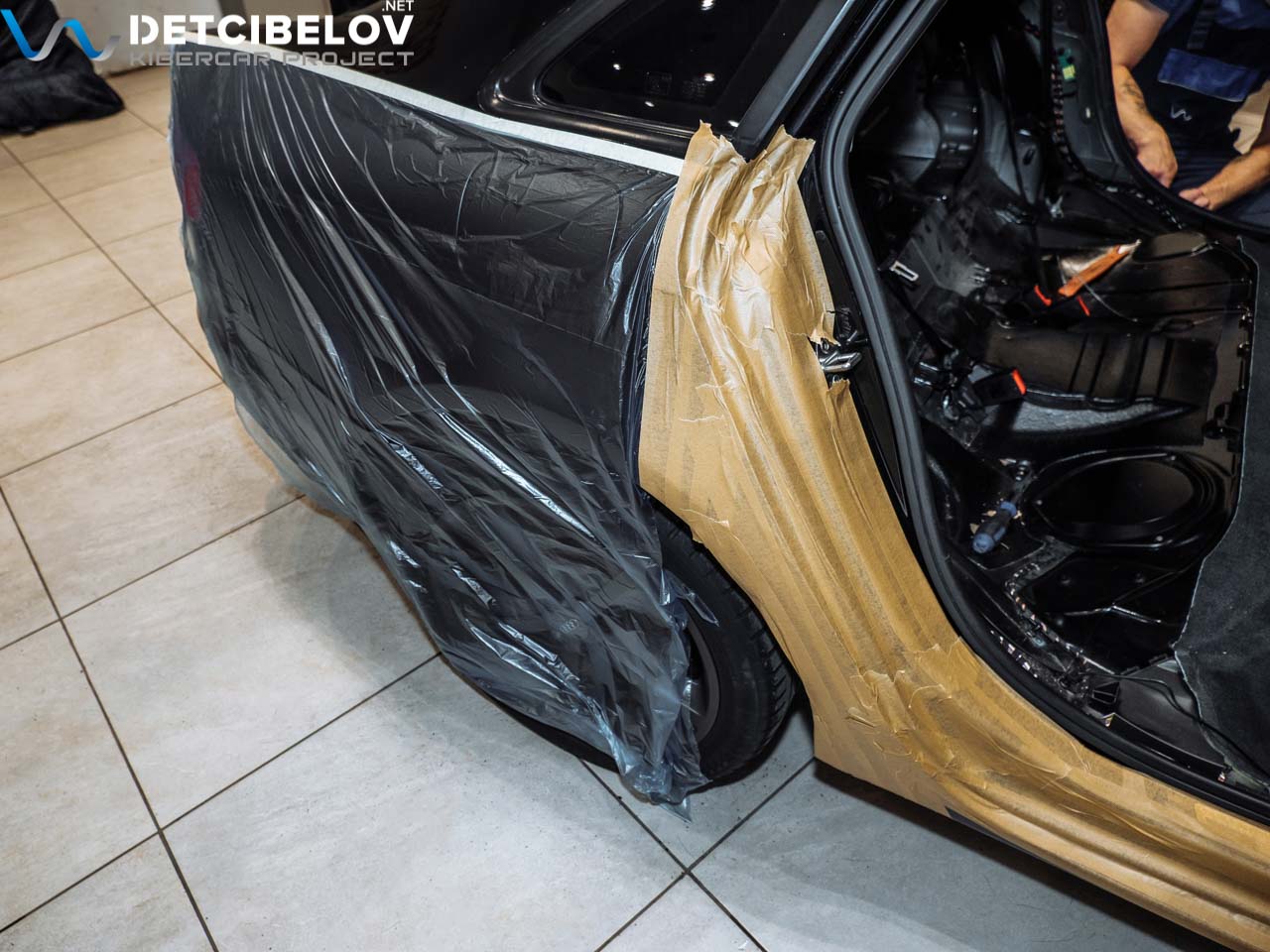 После того, как стоимость зафиксирована первый шаг перед комплексной шумоизоляцией Audi A4 под ключ – подготовительный. Во время установки материалов важно не повредить внешние и внутренние элементы. Мы оклеиваем кузов защитной пленкой, пороги и арки дверей – скотчем, а пластиковые детали оборачиваем стретч-пленкой. Для дверных карт и сидений подбираем защитные чехлы.