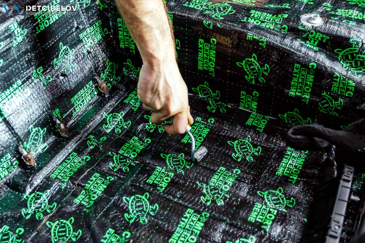 Для виброизоляции пола мы используем вибродемпфер Comfort mat Extreme 3.5 — это мастичнобитумный сэндвич с рекордной толщиной 3,5 мм и двумя слоями фольги, которые убирают низкочастотные структурные шумы металла. Это «Царь» среди виброизоляционных материалов с уникальной структурой мастики и лучшими показателями снижения вибрации. Нагреваем его при температуре 60-80 градусов в специальной печи – это обязательное условие, иначе качественно нанести этот материал не удастся. Его мы используем на полу и на задних колесных арках.