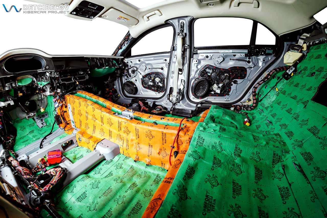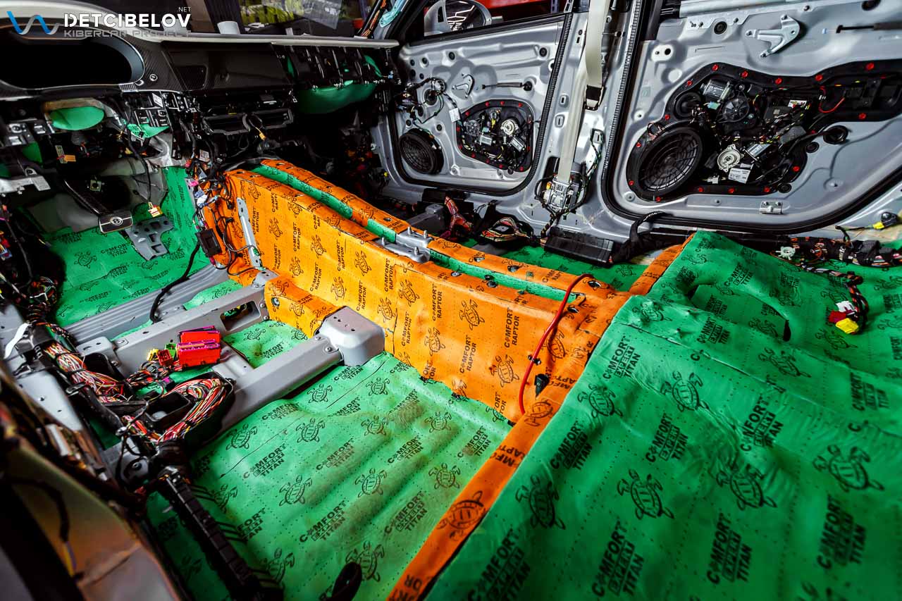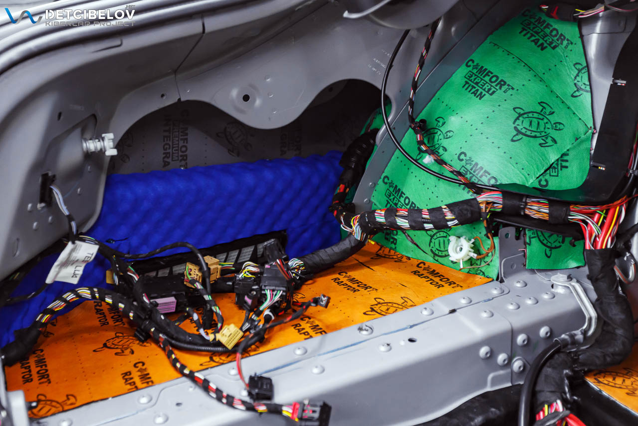 • Никаких компромиссов! Только топовые материалы последнего поколения от ТМ "Comfort mat" с максимальной эффективностью и максимальным количеством слоев. Также использование вибродемпфирующих материалов высокой жесткости с разогревом в печи и дополнительной напыляемой шумоизоляцией для колесных арок.