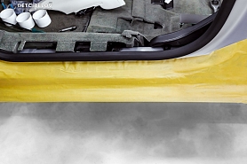 Приступаем к работе. Первым делом максимально защищаем автомобиль: оклеиваем пленкой все внешние элементы автомобиля, затем наносим скотч на пороги и арки дверей, упаковываем все мелкие пластиковые элементы в стретч-пленку. Сиденья и карты дверей помещаем в специальные чехлы.