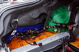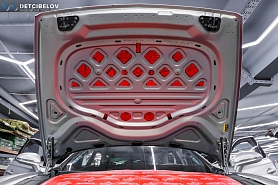 Капот. Внутреннюю поверхность капота обрабатываем материалом Aerocell QP Genio (4 мм), а на штатную шумотеплоизоляцию мы наклеили Comfort mat Fusion Red (3 мм).