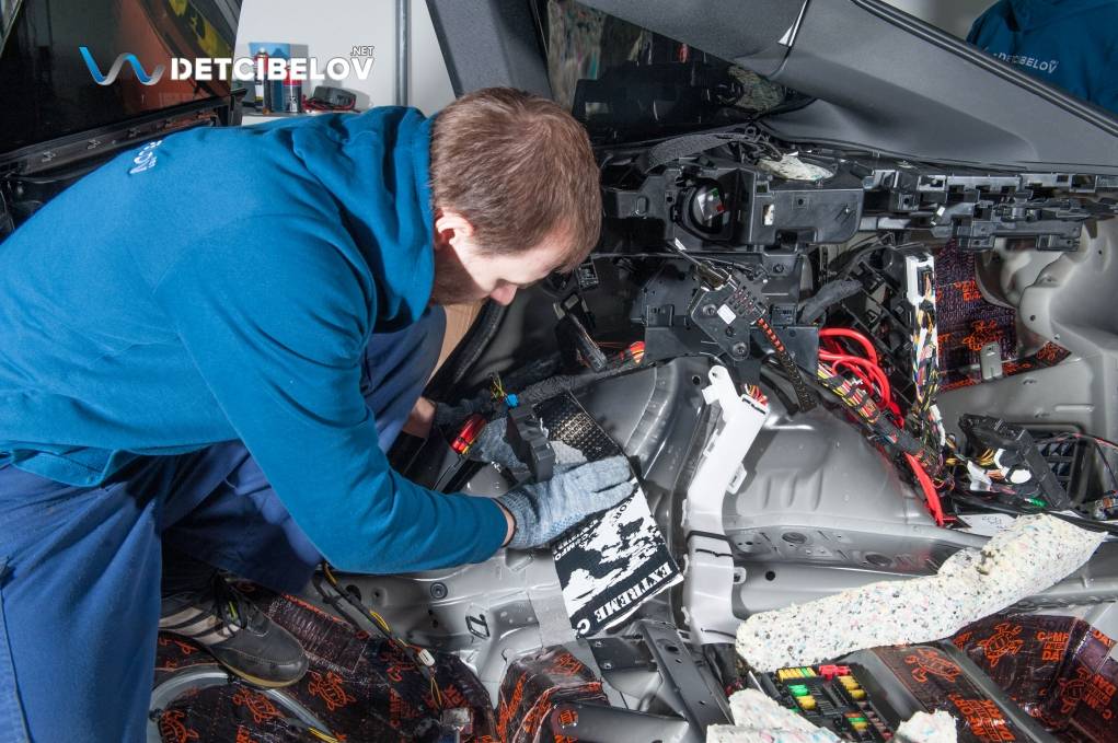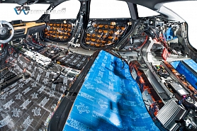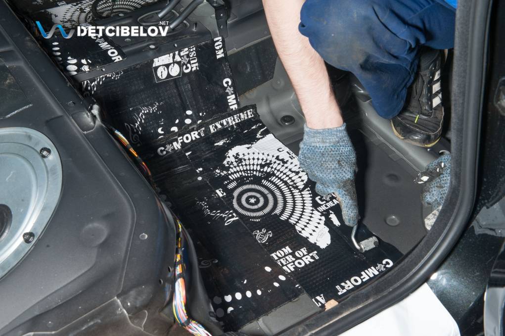 На этом этапе проводится подготовка и нанесение Comfort mat Extreme для виброизоляции различных компонентов машины. Из-за того, что данный материал является мастичной массой из битума с дополнительным укреплением фольгой, возможно добиться изоляции не только от типичных шумов, но и от едва различимых. Он считается лучшим в своей категории благодаря своей особой структуре мастики и выдающимся характеристикам по снижению вибрации, что делает его одним из наиболее подходящих и оптимальных материалов для шумоизоляции.