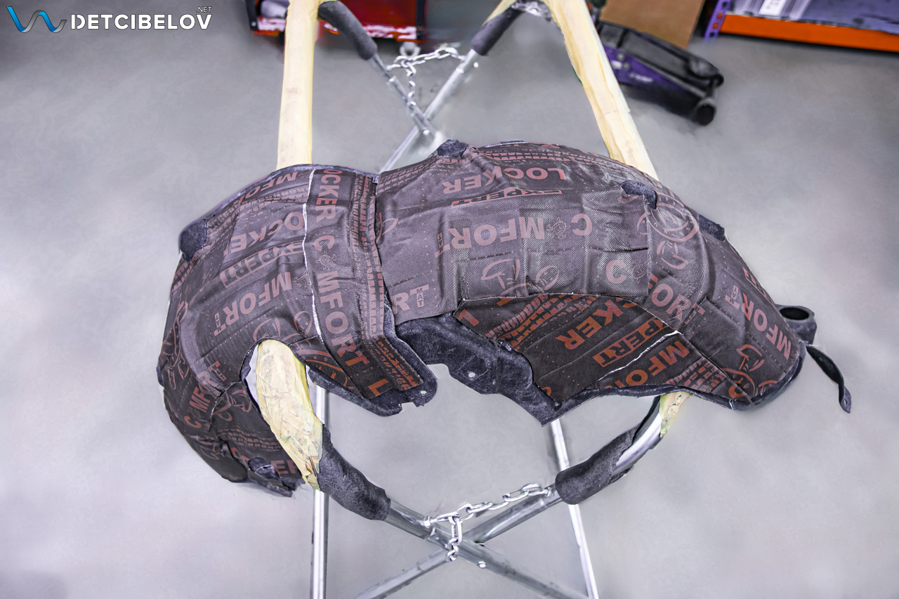 Подкрылки обезжириваем и наносим вибродемпфер Comfort mat Locker (3 мм) – абсолютно новая разработка облегченной звукоизоляционной мембраны для шумоизоляции войлочных подкрылков.