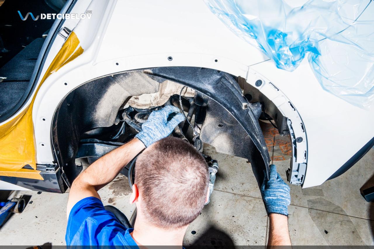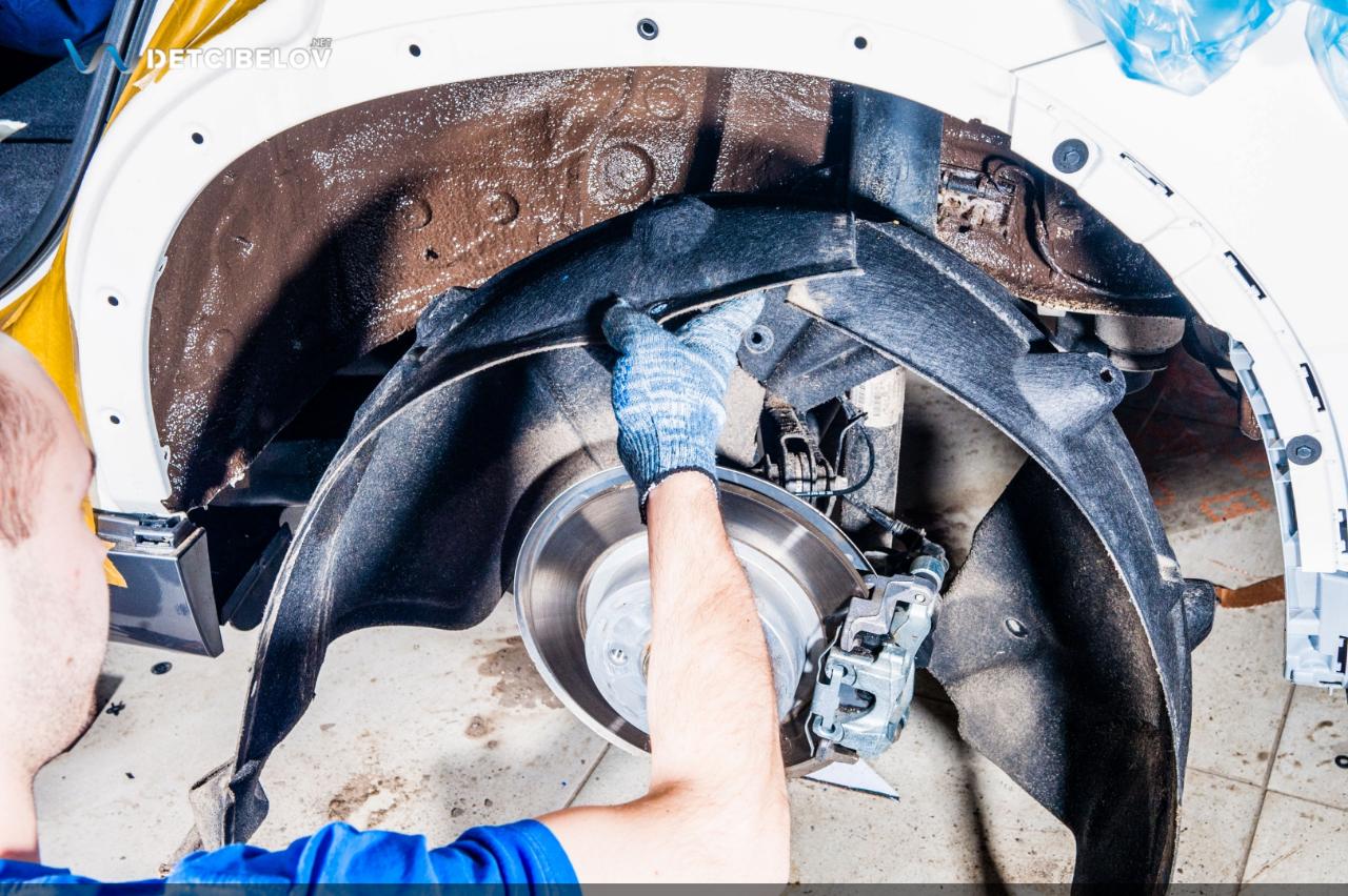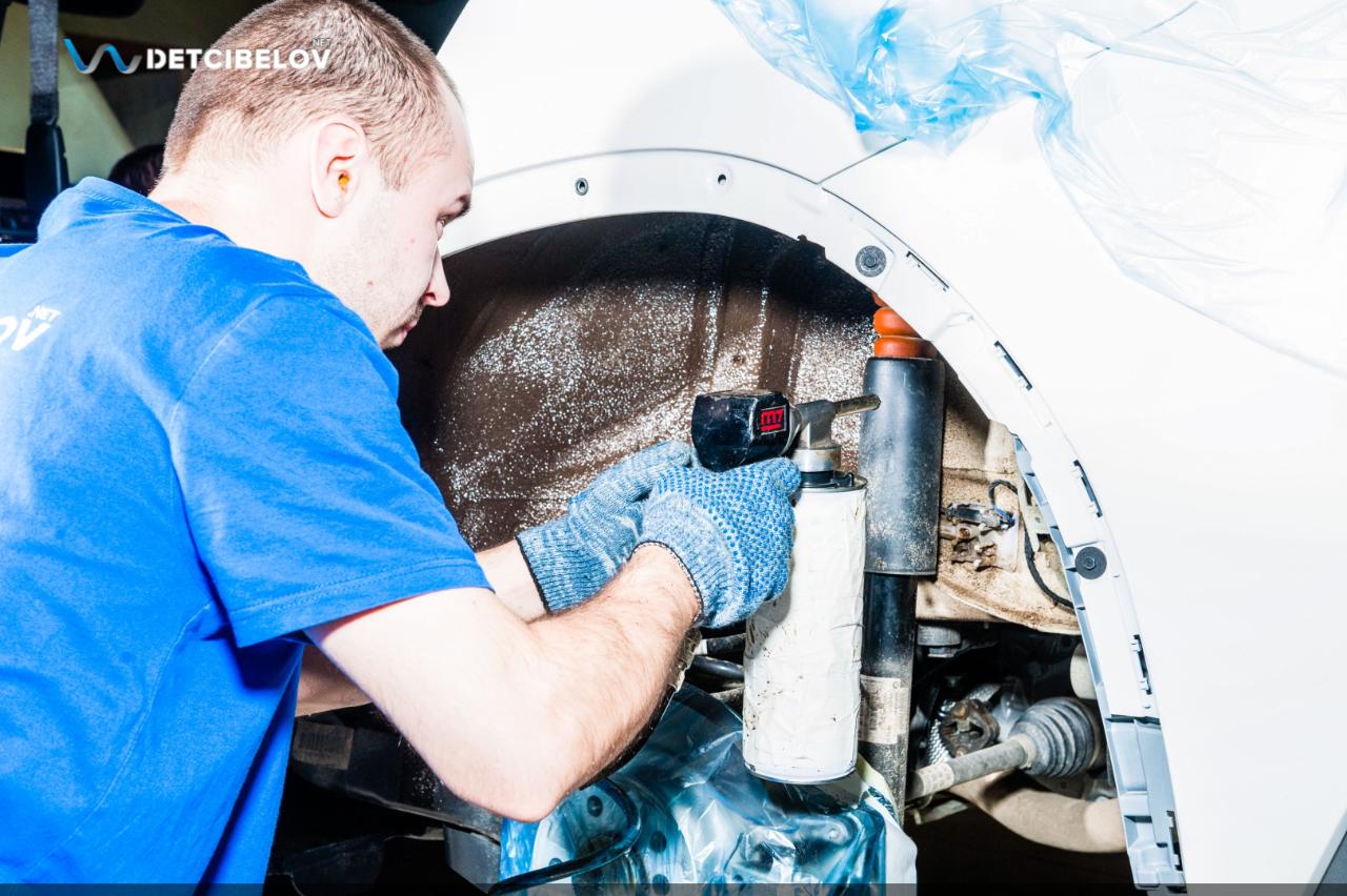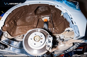 Последний этап отводится колесным аркам для того, чтоб исключить все шумы и скрипы резины. Перед работой снимается 4 подкрылка и обезжиривается поверхность.
