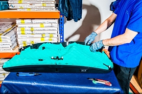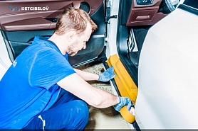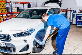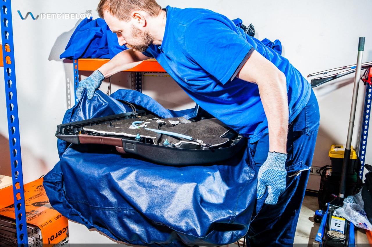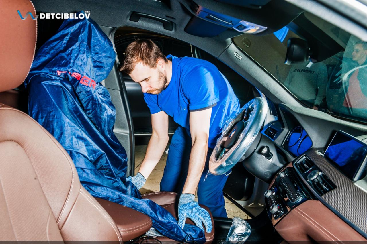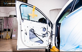 Перед началом работы мы оборачиваем всю машину снаружи пленкой, для порогов и арок применяется скотч, более мелкие внешние детали также удостоены большого внимания – они закрываются стретч-пленкой. Сиденья и карты дверей помещаются в специальные чехлы, которые помогут предупредить их загрязнение.