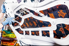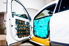 • Самая легкая шумоизоляция автомобиля от ведущих брендов. Она обеспечивает оптимальный результат при однослойной обработке кузова автомобиля. Материал обладает одновременно как шумо-, так и виброизоляционными свойствами, что позволяет укладывать материал в один слой, вместо двух, используемых при многослойной классической шумоизоляции автомобиля. Также мы дополнительно обрабатываем двери акустическим материалом для снижения скрипов и увеличения акустического комфорта.