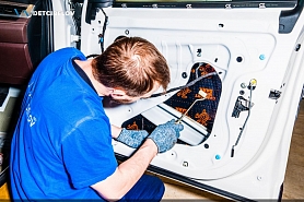 Начало процесса отводится дверям машины, мы подготавливаем их для дальнейшей работы – снимаем обшивку, обезжириваем всю рабочую поверхность и вычищаем все детали, на которые будет укладываться материал.