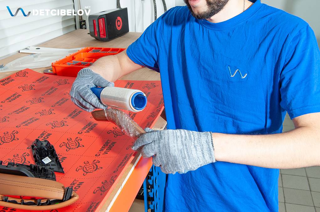 Наступает время наложения первых слоев виброизоляции. Первым слоем для салона является известный виброизолятор Extreme 3.5, для багажника и пола под задними сидениями мы используем Dark D3 Premium.