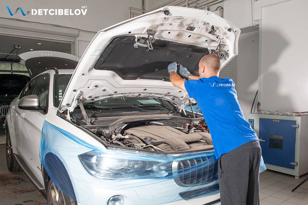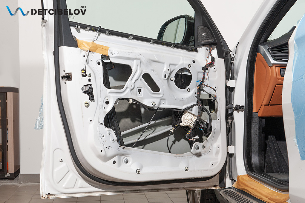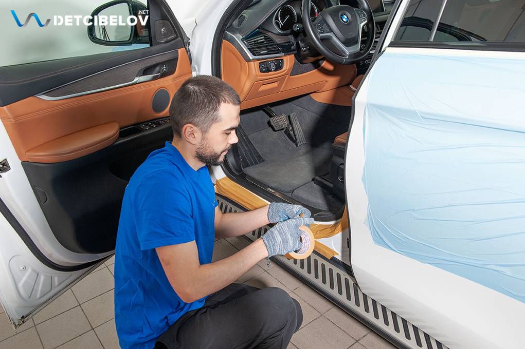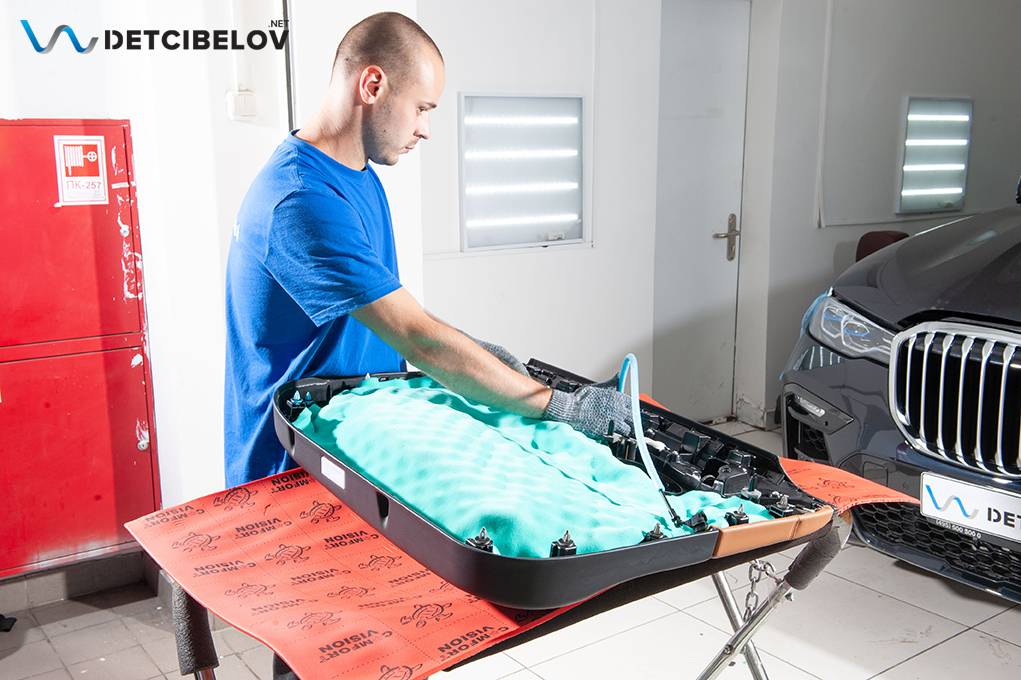 Как только вы обратились к нам по поводу шумоизоляции вашего BMW X6 II поколения (F16) под ключ, мы уведомляем о цене всех предоставляемых услуг, обговариваем нюансы и ваши предпочтения. В конце вы узнаете о расчете стоимости работы над вашим автомобилем. Перед началом процесса необходимо обезопасить от механических повреждений и загрязнений, для этого на крупные внешние элементы оклеиваются пленкой. Для порогов и арок дверей используется скотч, а более мелкие пластиковые детали мы оборачиваем в стретч-пленку. Перед тем, как приступать к шумоизоляции в салоне мы надеваем на сиденья и рамки дверей специальные чехлы, чтоб сохранить их чистоту и предупредить повреждения.