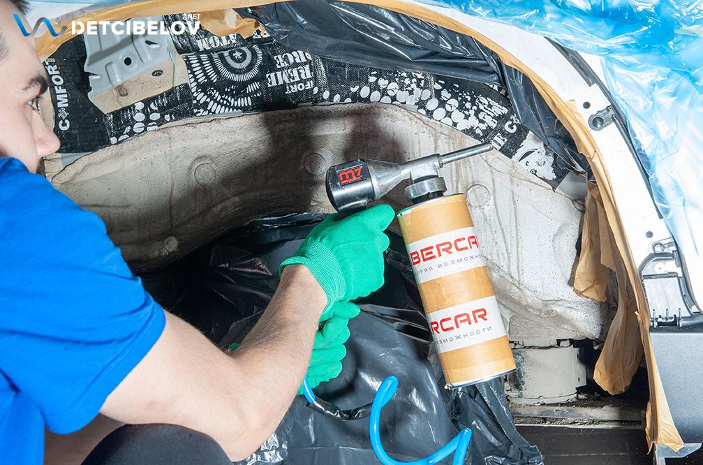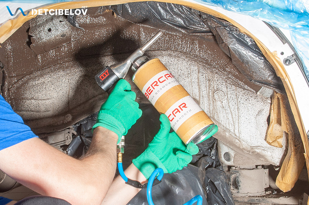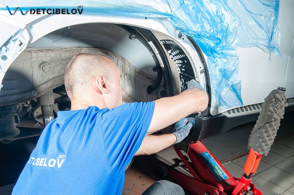 Последний этап отводится колесным аркам для того, чтобы исключить попадания звука от трения резины в салон и обеспечить комфортной поездкой водителя. Перед началом процесса необходимо произвести демонтаж - снимаем четыре подкрылка, обезжириваем и очищаем все нужные в ходе работы поверхности.