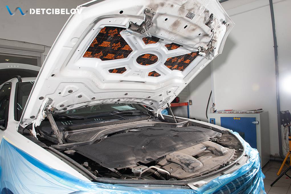 Начинаем с капота. Для данного этапа потребуется только 1 слой на каждую зону, он будет состоять из двух разных материалов, которые будут справляться со своей функцией. Отдельно для капота, его внутренней поверхности, предусмотрен монтаж виброизолирующего материала Dark D3 Premium. Он будет заглушать все волны, исходящие от мотора.