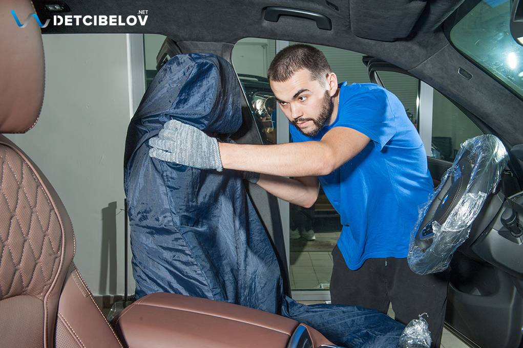 Для начала необходимо обернуть все крупные внешние пластиковые элементы специальной пленкой, для порогов и арок предусмотрена защита при помощи скотча, более мелкие пластиковые детали оборачиваются стретч-пленкой. При работе внутри салона мы защищаем сидения и карты дверей от загрязнения и механических повреждений специализированными чехлами.