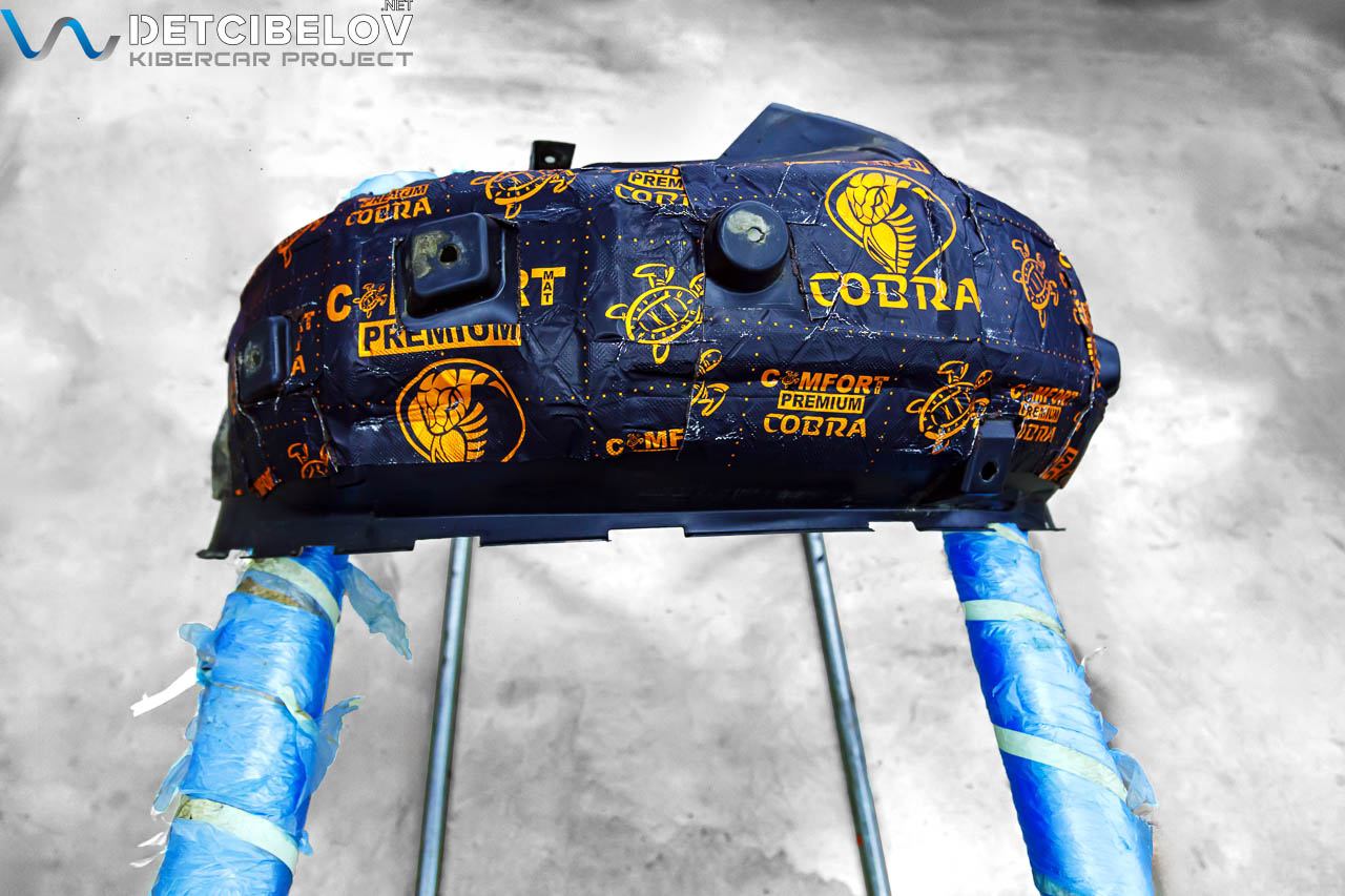 Процесс шумоизоляции начинается с внешней стороны арок в несколько слоев. Первым идет Comfort mat Extreme. Эффективный вибродемпфирующий материал, состоящий из нескольких слоев, каждый из которых поглощает максимально возможное количество издаваемых вибраций.