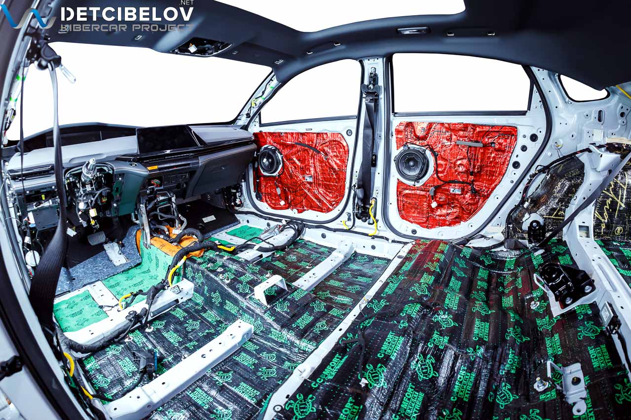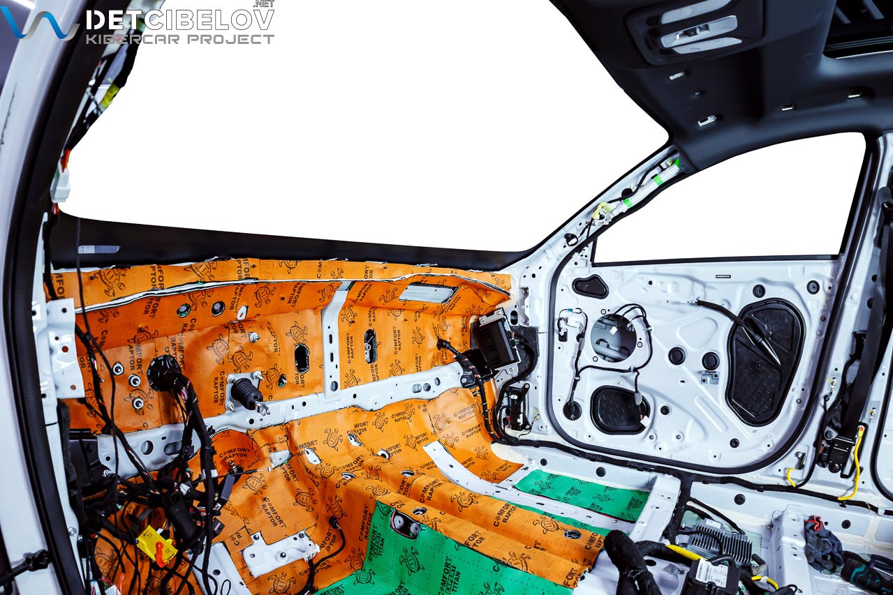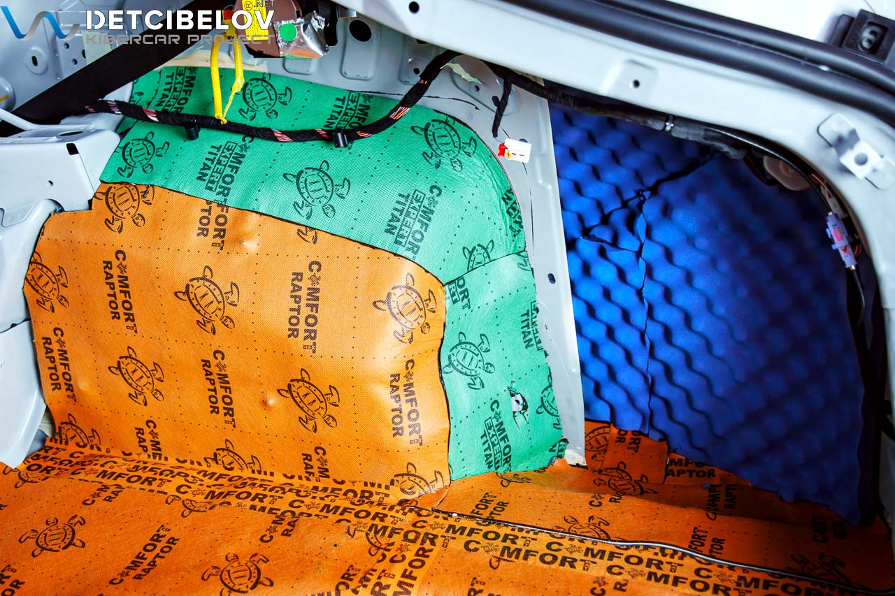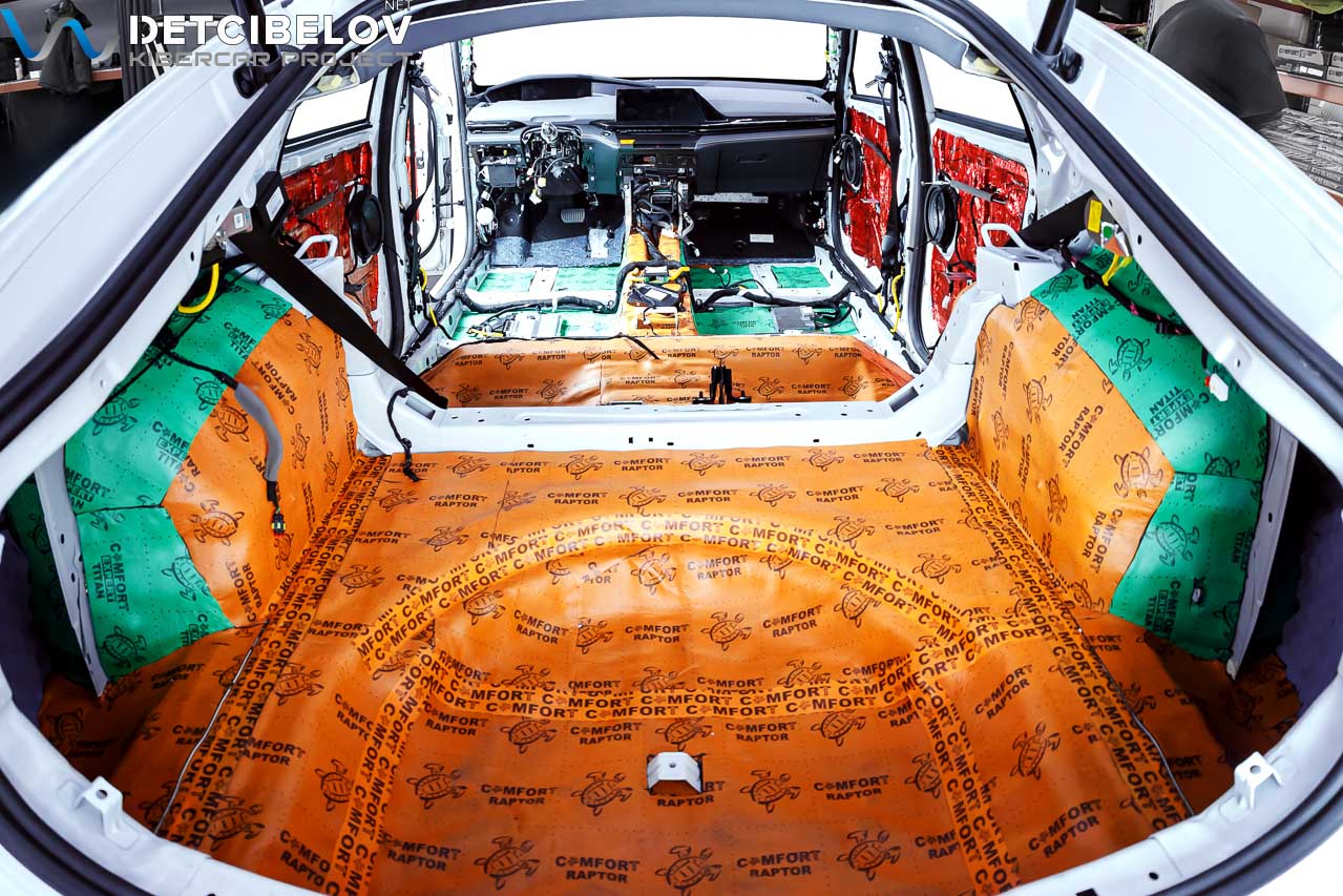 • Никаких компромиссов! Только топовые материалы последнего поколения от ТМ "Comfort mat" с максимальной эффективностью и максимальным количеством слоев. Также использование вибродемпфирующих материалов высокой жесткости с разогревом в печи и дополнительной напыляемой шумоизоляцией для колесных арок.