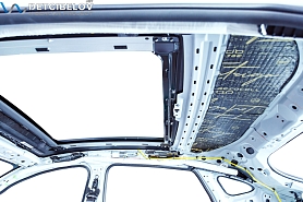 Следующий этап – шумоизоляция крыши. Максимально аккуратно чистыми одноразовыми перчатками демонтируем потолочную обшивку и обезжириваем поверхность потолка. После предварительной подготовки приступаем к шумоизоляции.