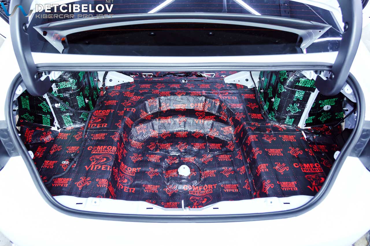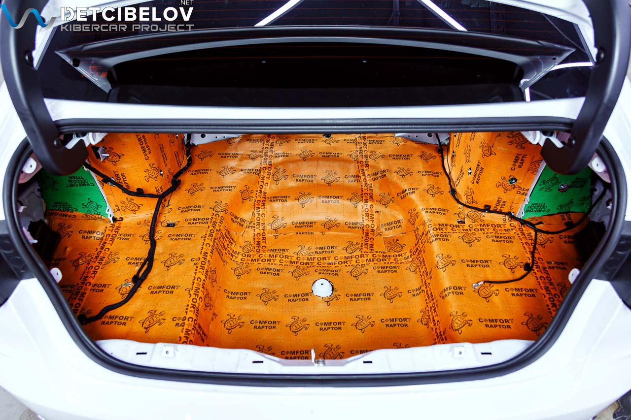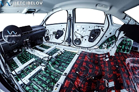 • Никаких компромиссов! Только топовые материалы последнего поколения от ТМ "Comfort mat" с максимальной эффективностью и максимальным количеством слоев. Также использование вибродемпфирующих материалов высокой жесткости с разогревом в печи и дополнительной напыляемой шумоизоляцией для колесных арок.