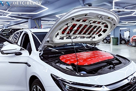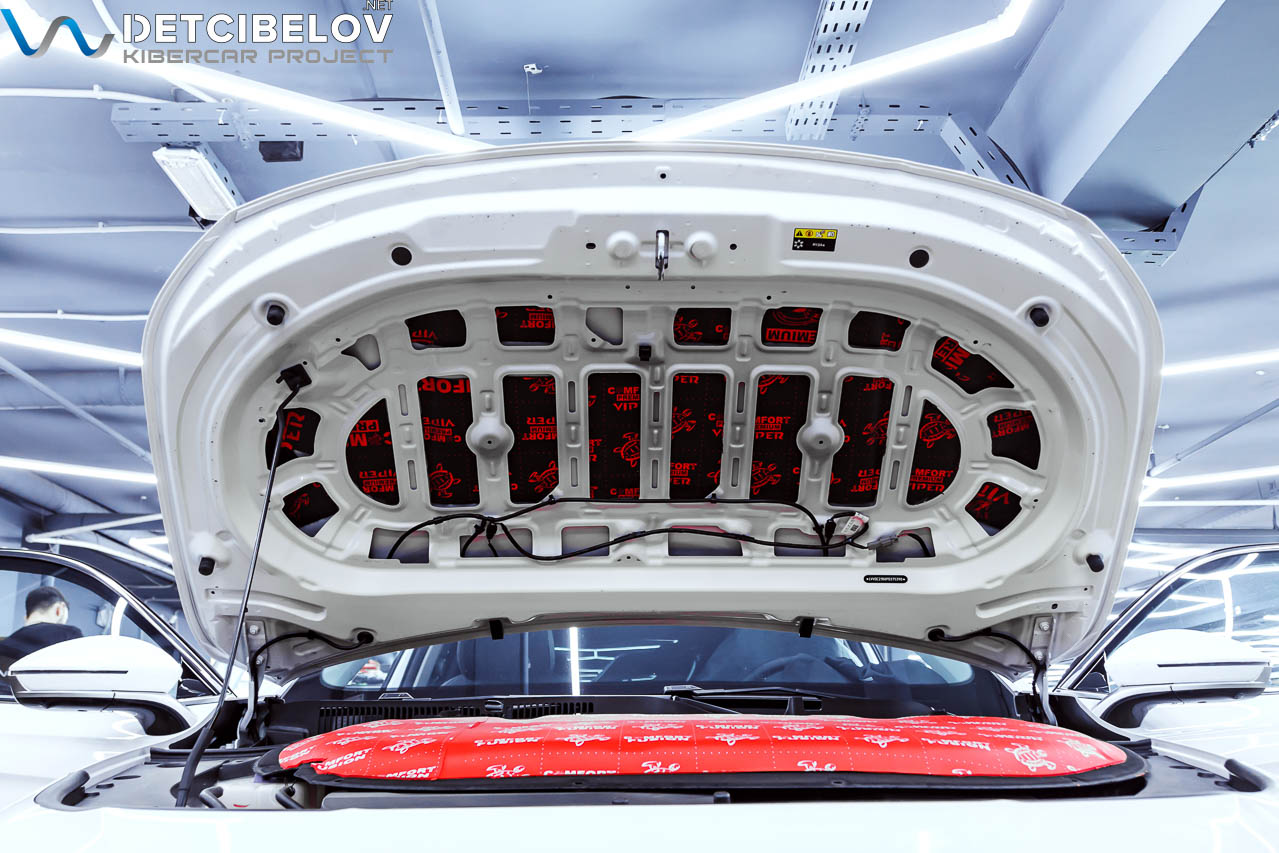 Чтобы уменьшить шум, который создает двигатель во время работы, нужно обесшумить капот. Кроме того, это поможет снизить риски его поломки из-за экстремальных температур: мотор будет медленнее остывать зимой, и нагреваться – летом. Порядок обесшумливания на этом участке стандартный: наносим слой виброизоляции Comfort mat Viper (3 мм), а поверх штатной шумотеплоизоляции клеим один слой Comfort mat Fusion Red (3 мм) – тонкого, но эффективного материала с комбинированными свойствами.