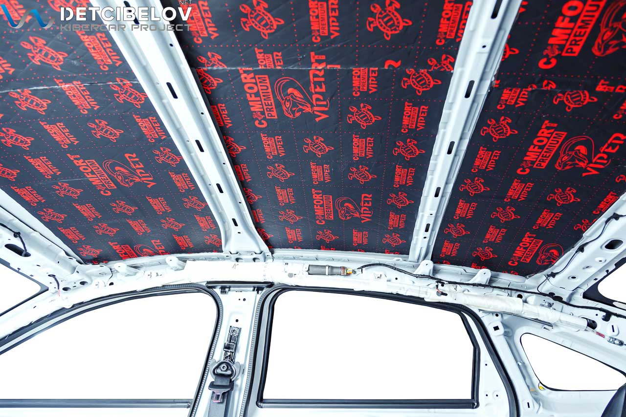 Далее команда переходит к обесшумливанию крыши. Шумоизоляционный сэндвич на этом участке должен быть эффективным, но в то же время легким. Для начала, после демонтажа обшивки потолка и обезжиривания поверхности металла укладываем слой вибродемпфера Comfort mat Viper (3 мм) – универсального материала, который уже использовался нами для виброизоляции дверей.