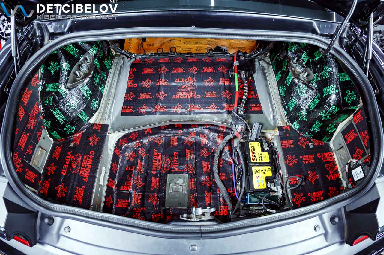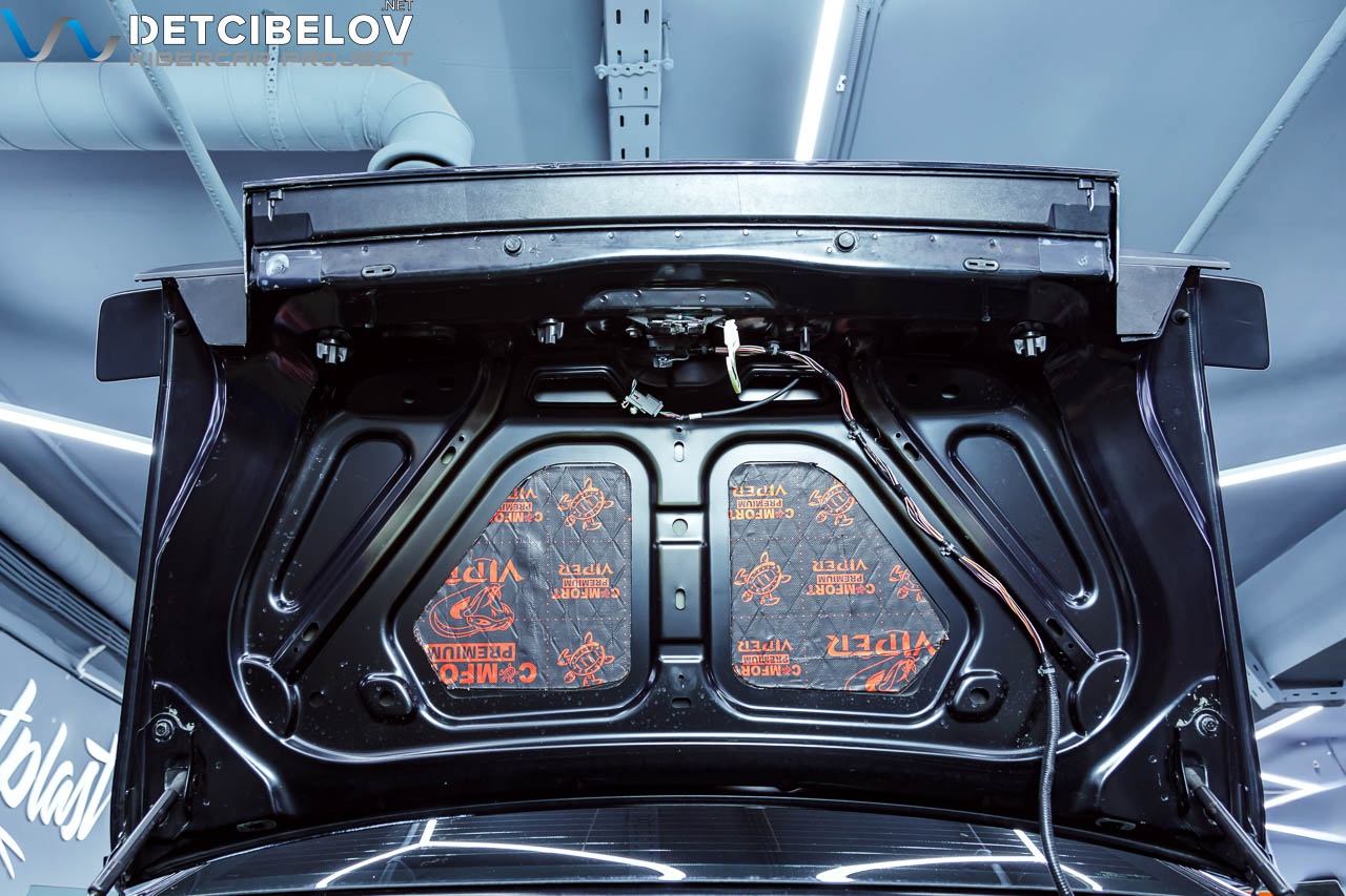 Затем мастера переходят к обезжириванию поверхности крышки багажника и наносят очередной слой виброизоляции Viper (3 мм).