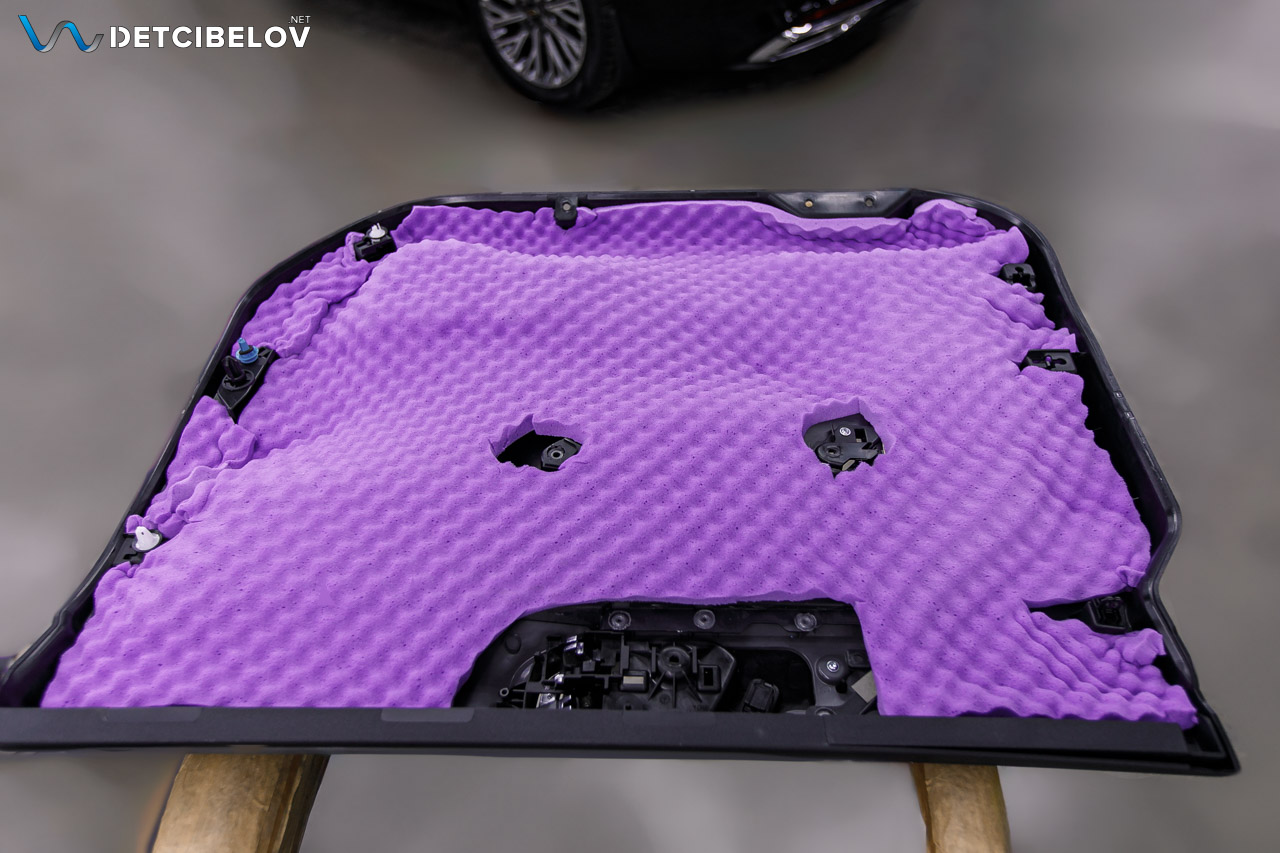 Заключительным слоем используем шумопоглощающий материал последнего поколения – пенополиуретановую пенорезину StP Biplast Premium (15 мм) с увеличенным коэффициентом шумопоглощения, который окончательно задерживает посторонние шумы. Этот же материал, выступает в роли антискрипа. Наносим его на карты дверей.
