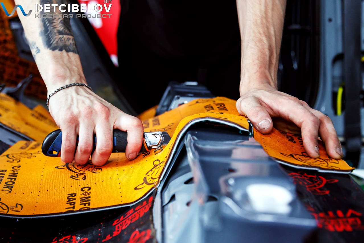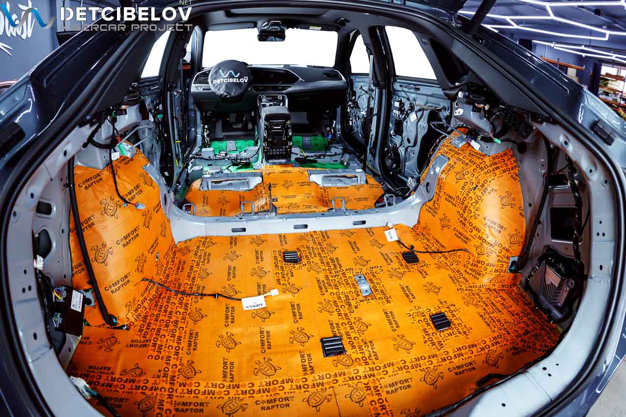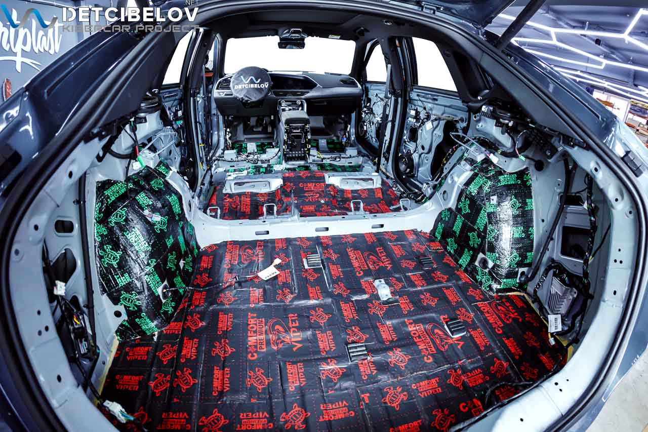 • Никаких компромиссов! Только топовые материалы последнего поколения от ТМ "Comfort mat" с максимальной эффективностью и максимальным количеством слоев. Также использование вибродемпфирующих материалов высокой жесткости с разогревом в печи и дополнительной напыляемой шумоизоляцией для колесных арок.
