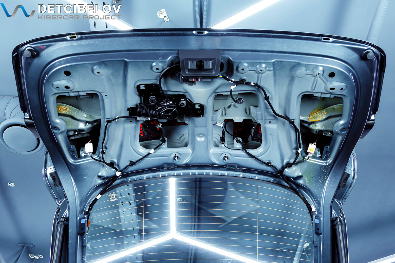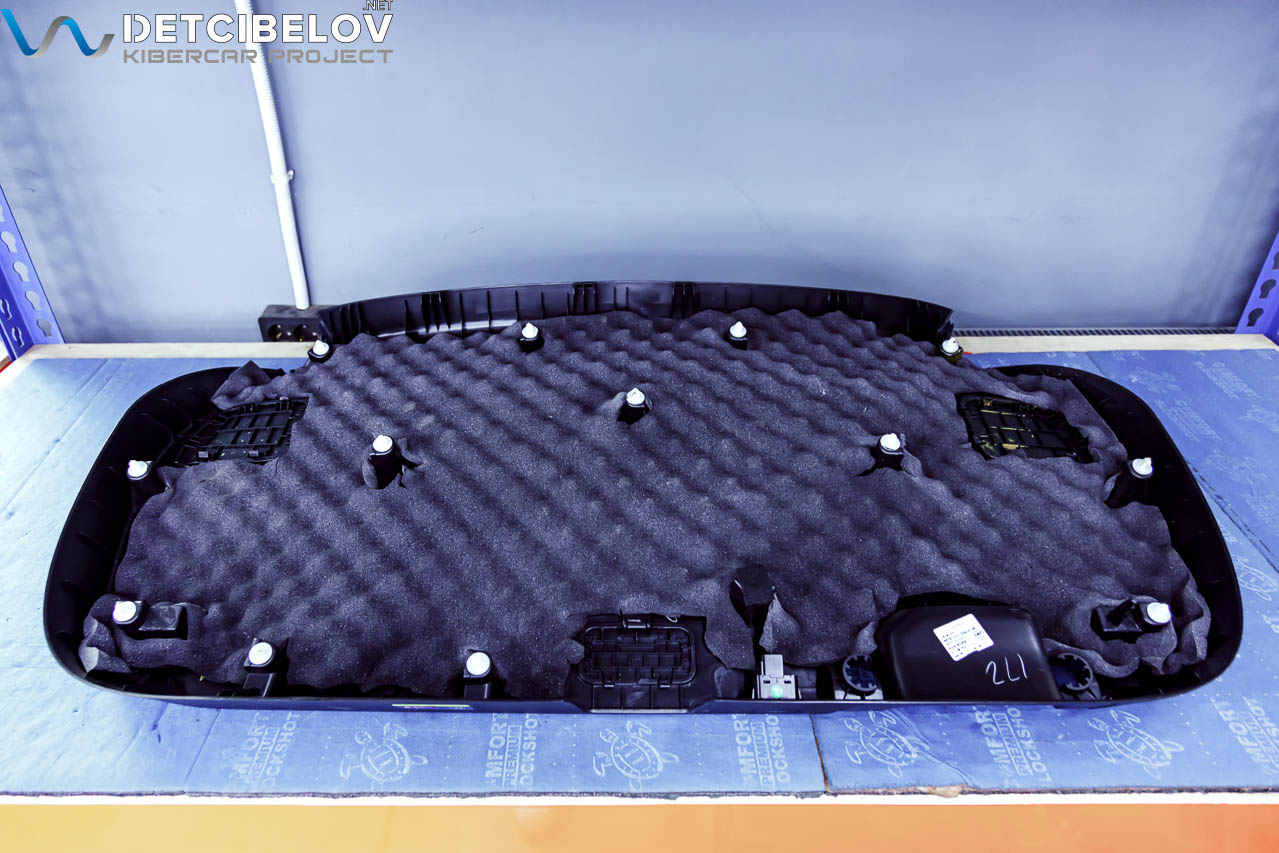 На крышке багажника укладываем слой легкого вибродемпфера премиального уровня Comfort mat Viper (3 мм). Участок с пластиковой панелью обклеиваем шумопоглощающим полимером Comfort mat Wave Expert (15 мм). Он обладает эффектом памяти, поэтому не занимает слишком много места, а малый вес позволяет закрывать и открывать крышку без каких-либо помех.