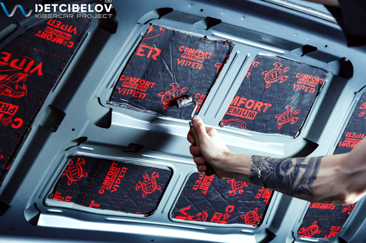 Шумоизоляция капота помогает изолировать шум, который возникает от работы двигателя. Она также снижает вероятность поломки из-за перегрева или переохлаждения мотора, так как снижает теплопотери. Для начала на внутренней поверхности капота мы используем Comfort mat Viper (3 мм) – материал, который уменьшит вибрации и не даст им проникать внутрь салона.