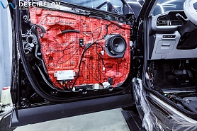• Самая легкая шумоизоляция автомобиля от ведущих брендов. Она обеспечивает оптимальный результат при однослойной обработке кузова автомобиля. Материал обладает одновременно как шумо-, так и виброизоляционными свойствами, что позволяет укладывать материал в один слой, вместо двух, используемых при многослойной классической шумоизоляции автомобиля. Также мы дополнительно обрабатываем двери акустическим материалом для снижения скрипов и увеличения акустического комфорта.