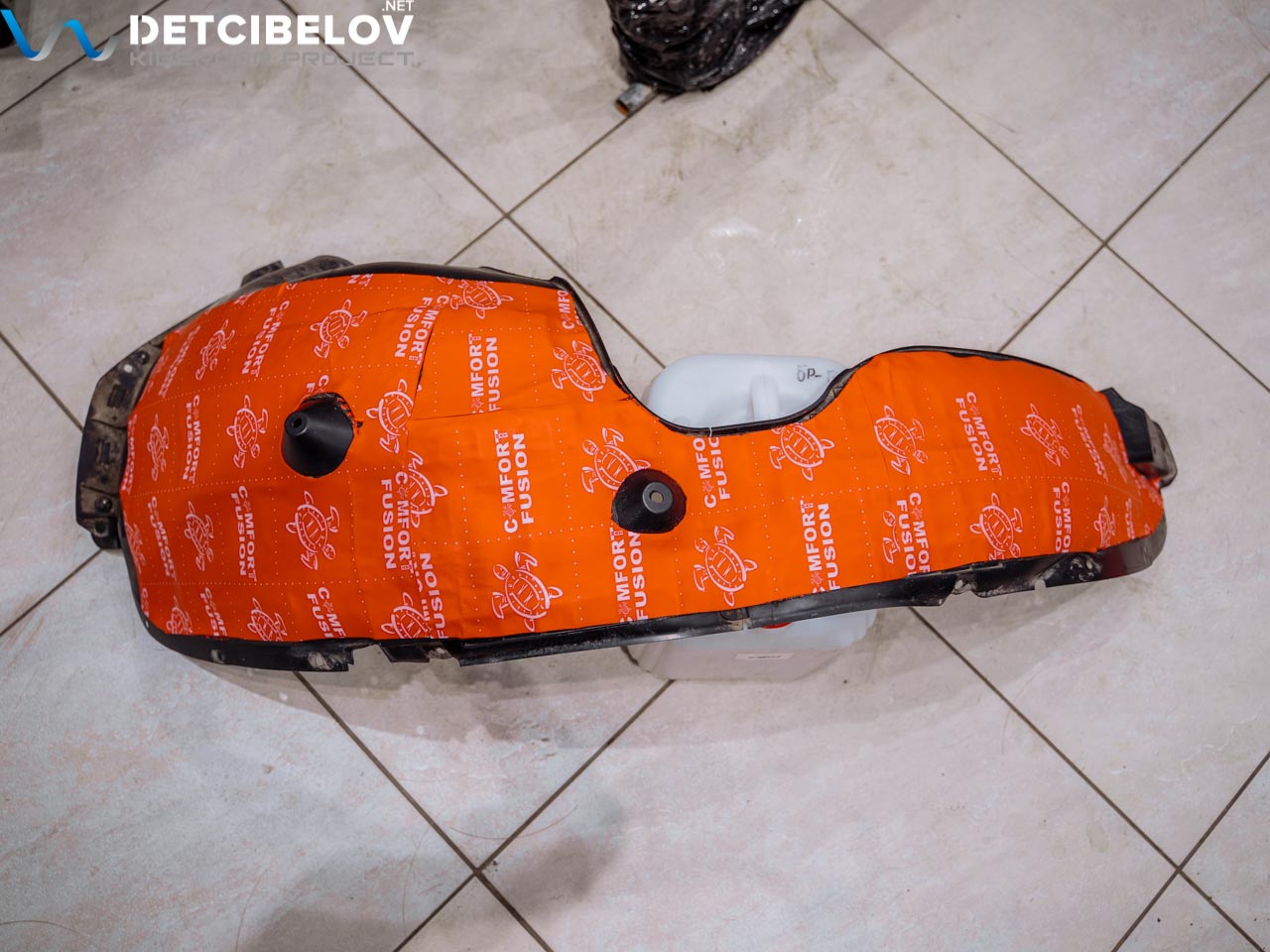 На полу в салоне и внутренних арках укладываем Comfort mat Titan – материал с многослойной структурой, объединяющий акустическую мембрану и звукоизолятор. Он также снижает уровень теплопотерь, выступая в качестве уплотнителя.