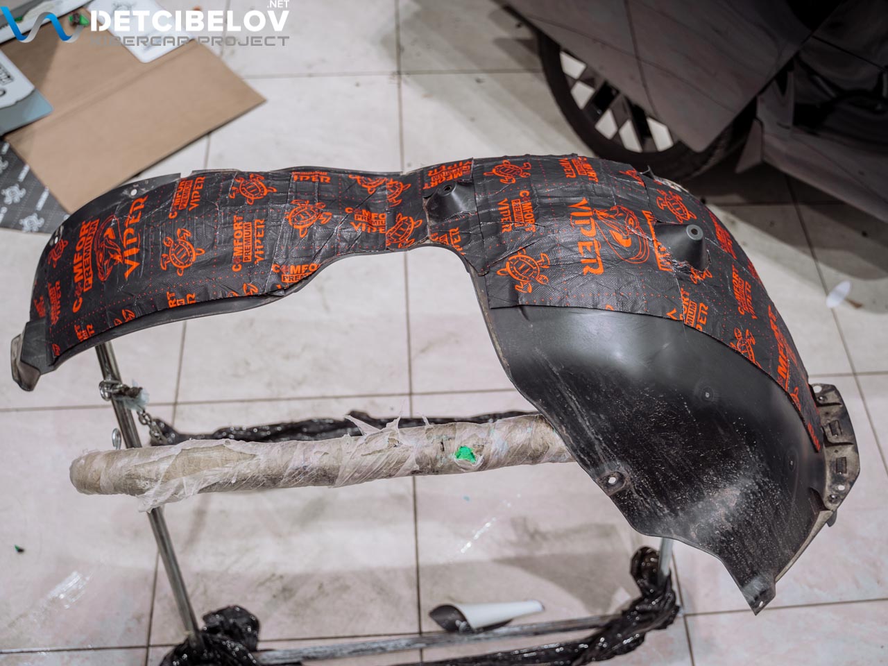 Третьим слоем на этом участке используется вибродемпфер Comfort mat Viper, наносимый уже на подкрылки. Толщина материала составляет всего 3 мм, что не мешает ему эффективно блокировать шумы и вибрации. Высокий уровень КМП сочетается в этом продукте с легкостью и влагостойкостью, что важно на участке колесных арок.