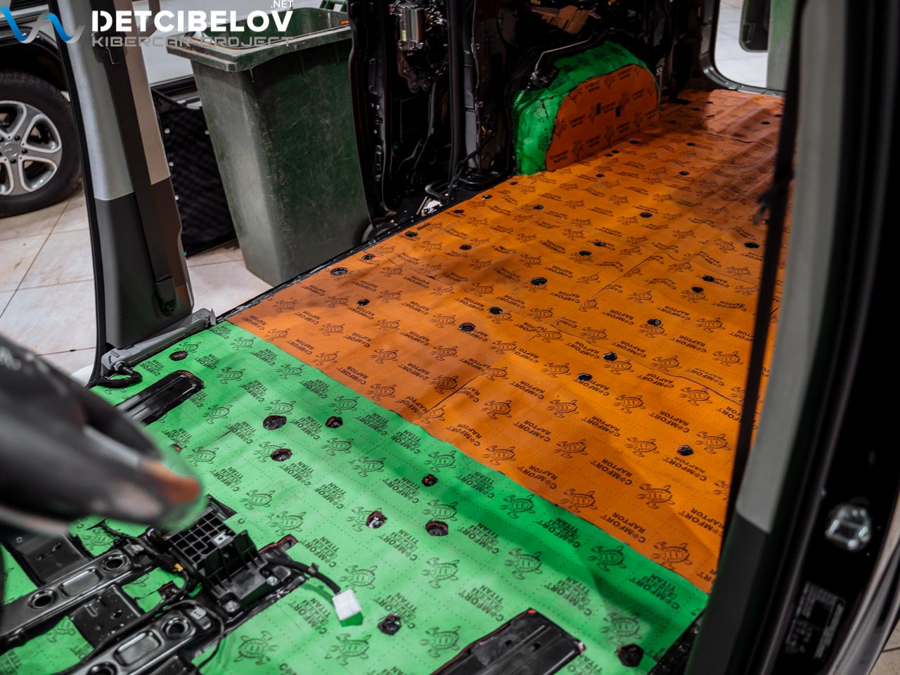 В качестве первого слоя на этом участке используется вибродемпфер, рассчитанный на экстремальные нагрузки. Это многослойный материал Comfort mat Extreme. Перед укладкой он разогревается в специальной печи для улучшения адгезии.