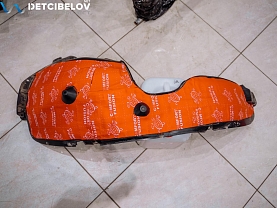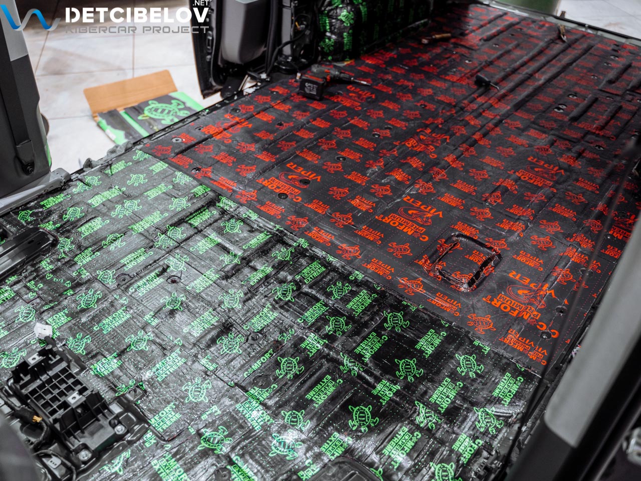 Для виброизоляции пола используем комбинацию из Comfort mat Extreme и Comfort mat Viper. Первый вибродемпфер укладываем на большей части пола и внутренних арках: оптимален для сильно вибронагруженных зон. Материал характеризуется высоким коэффициентом механических потерь, антикоррозийными и герметизирующими свойствами.