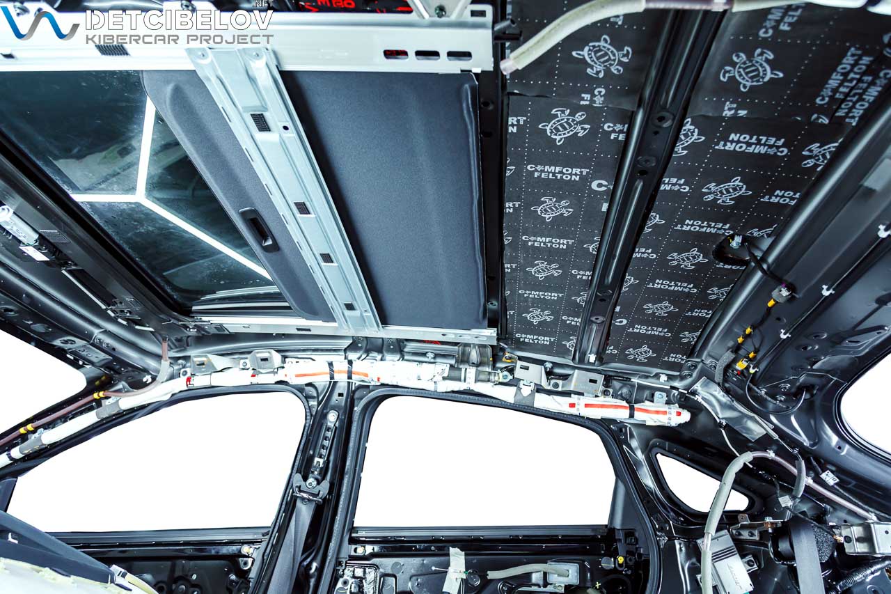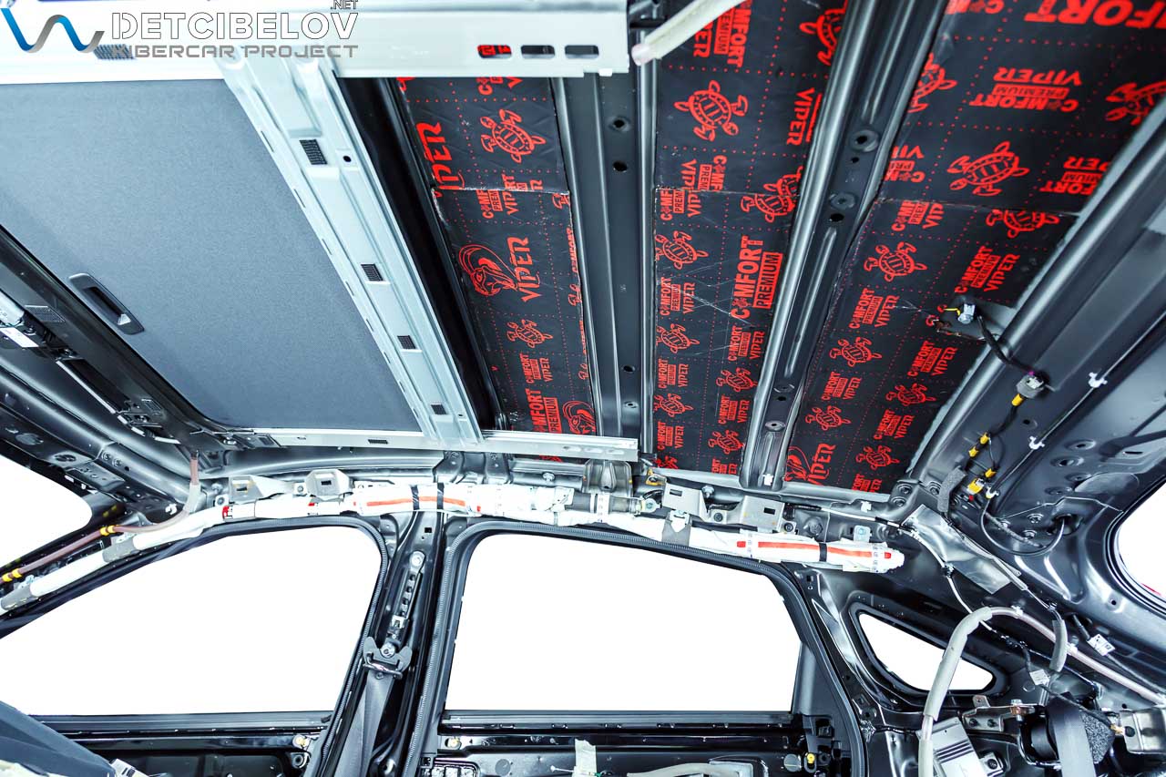 Удаляем обшивку потолка и обезжириваем поверхность металла. Чтобы крыша меньше вибрировала во время движения, ее нужно укрепить. Используем для этого слой тонкого вибродемпфера Comfort mat Viper (3 мм).