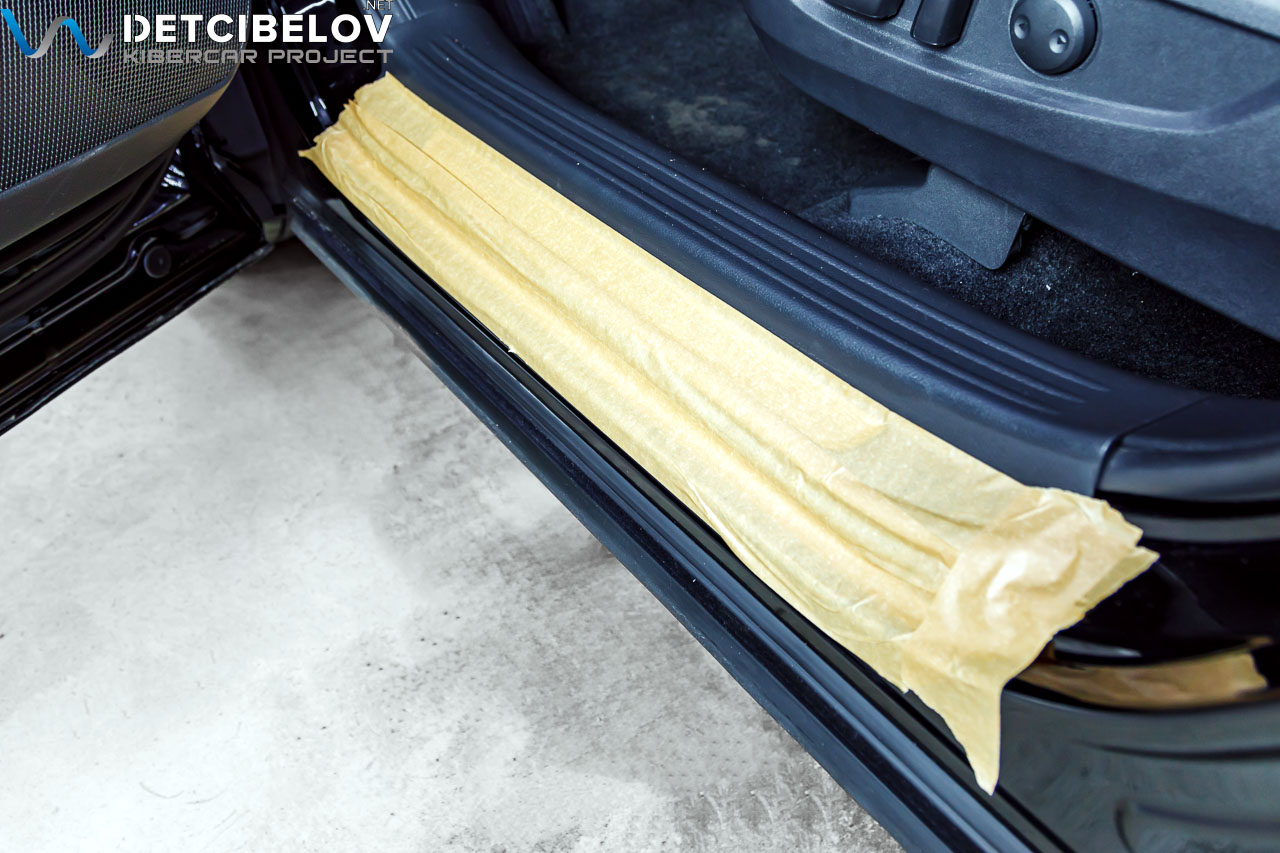 Защищает внешние элементы кузова пленкой, чтобы не поцарапать во время проведения работ. Для внутренних элементов подбираем специальные защитные чехлы, максимально освобождаем салон. Предварительно оклеиваем пороги и карты дверей скотчем.