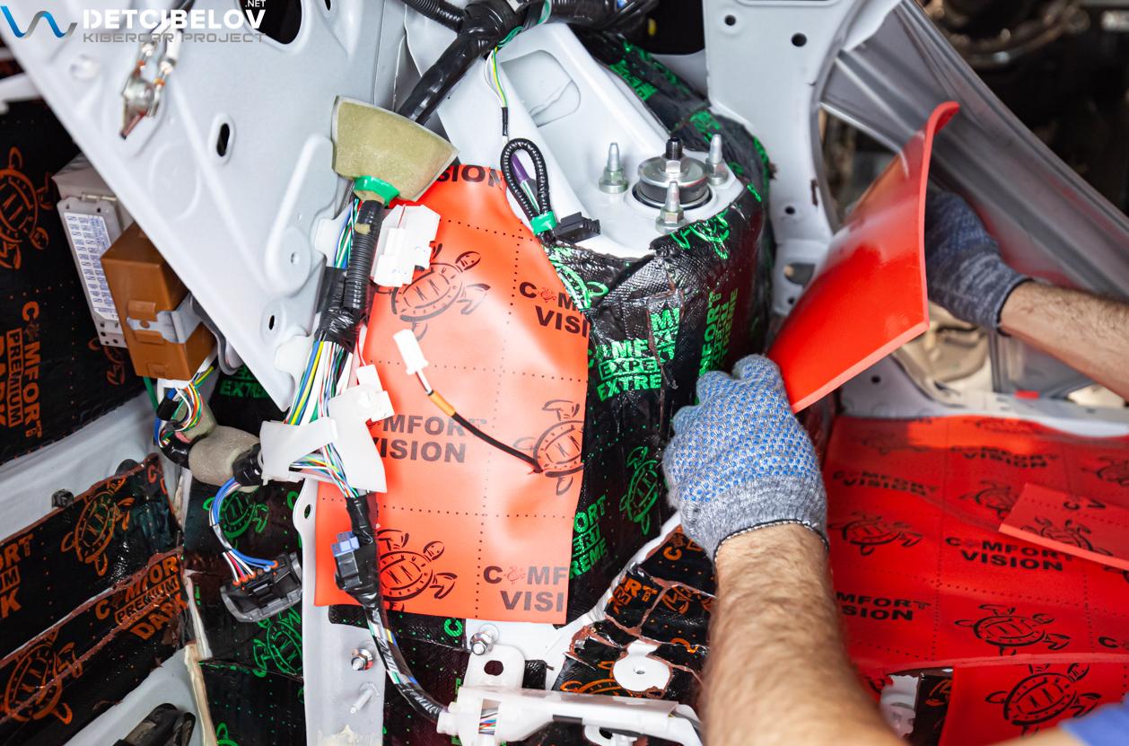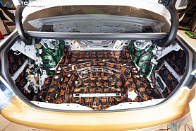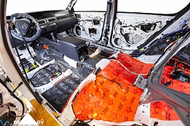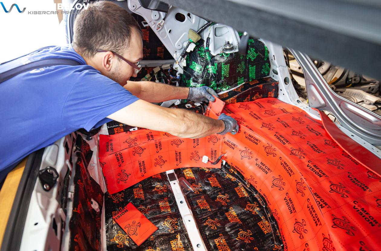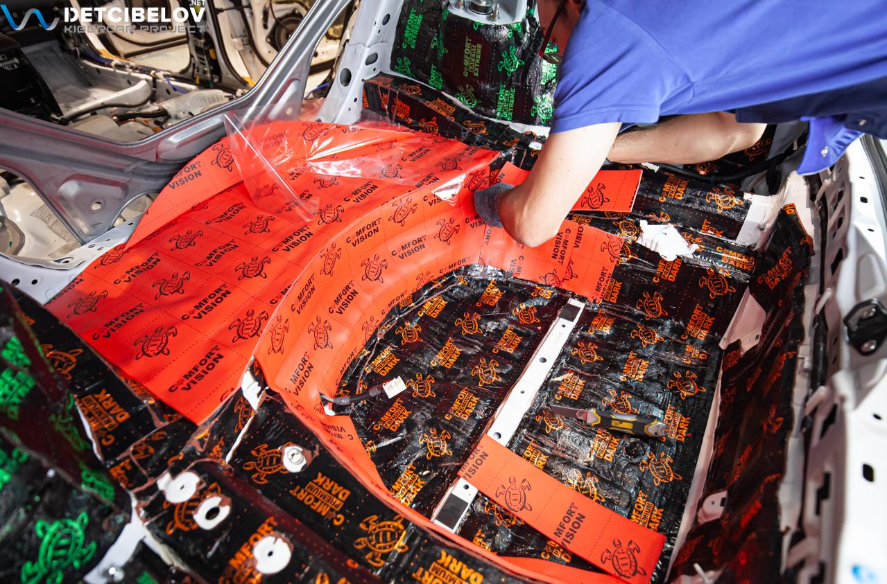 • Никаких компромиссов! Только топовые материалы последнего поколения от ТМ "Comfort mat" с максимальной эффективностью и максимальным количеством слоев. Также использование вибродемпфирующих материалов высокой жесткости с разогревом в печи и дополнительной напыляемой шумоизоляцией для колесных арок.