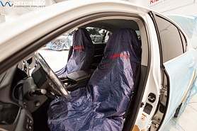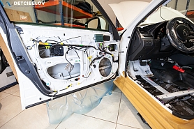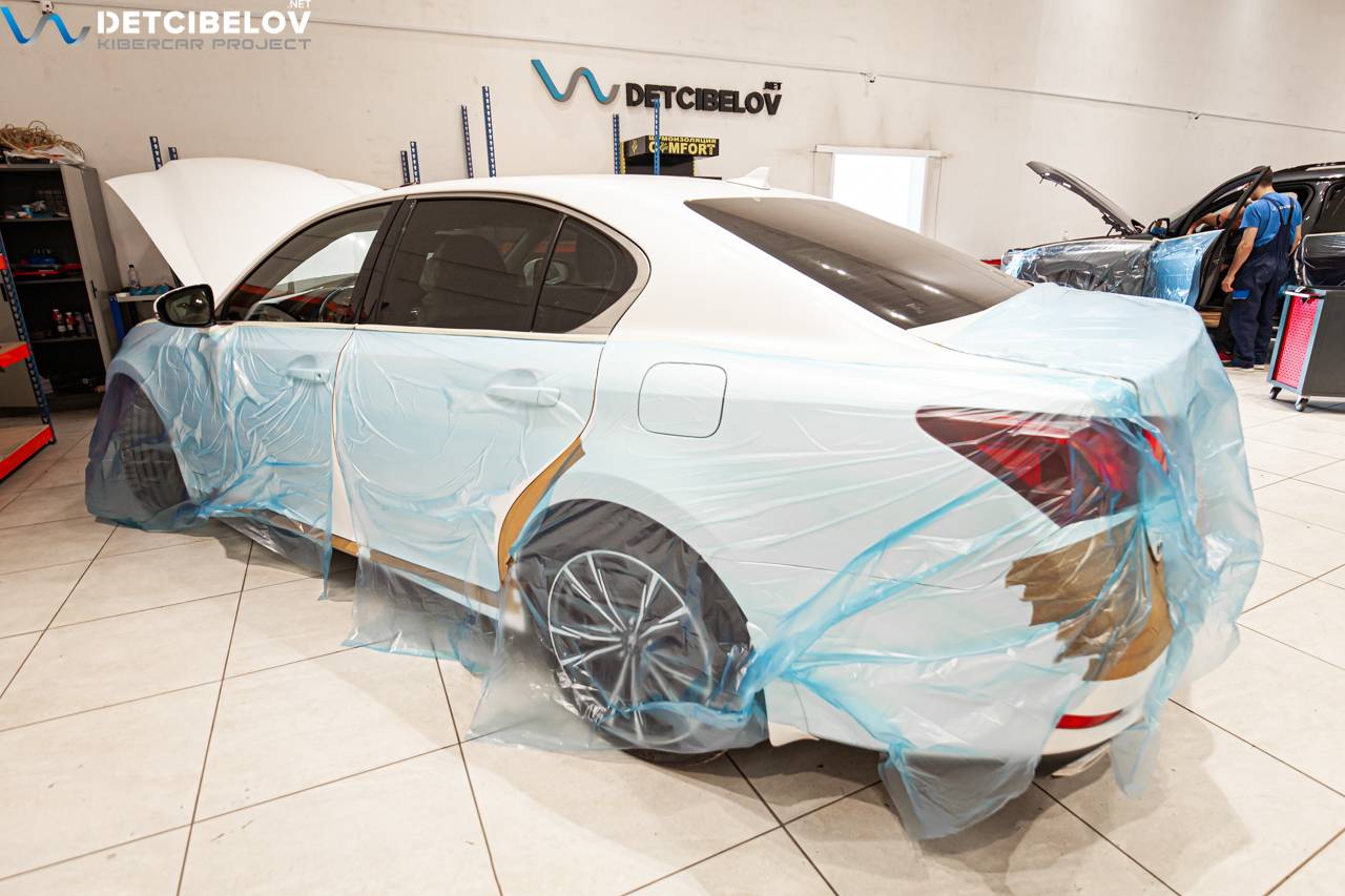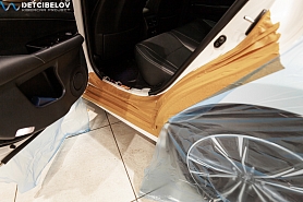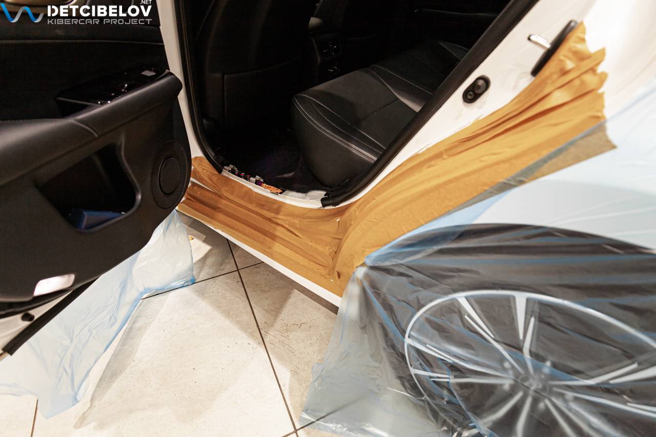 Обесшумливание Lexus GS IV поколение Рестайлинг начинаем с защиты открытых поверхностей и внешних элементов. Используем для этого пленку и скотч, которым обклеиваем арки дверей и пороги. Для защиты мелких пластиковых элементов упаковываем их в стретч-пленку, дверных карт и сидений – в чехлы.