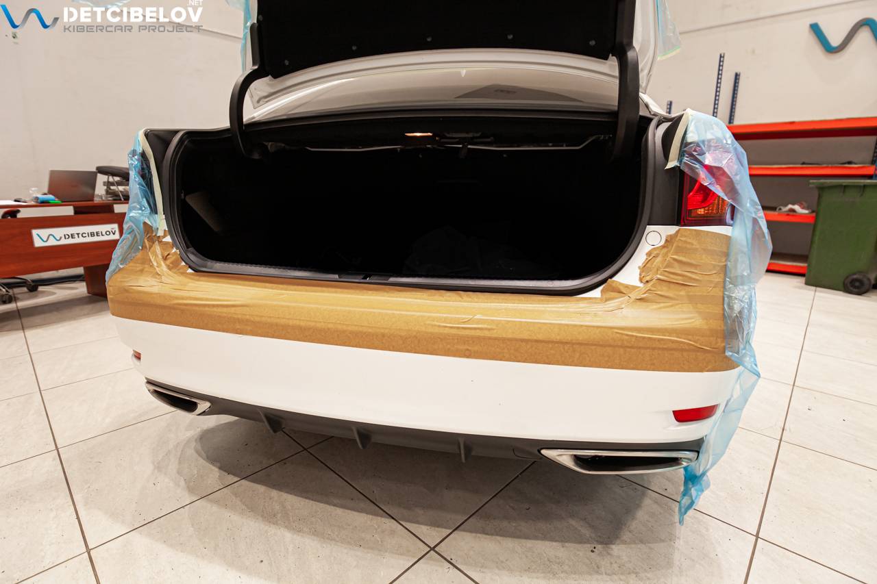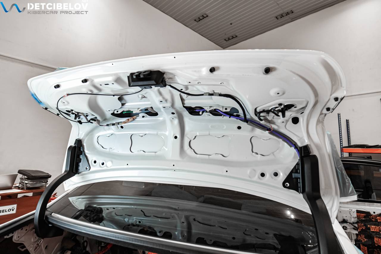 Следующий этап – шумоизоляция крышки багажника. Максимально аккуратно чистыми одноразовыми перчатками демонтируем обшивку и обезжириваем поверхность. После предварительной подготовки приступаем к шумоизоляции.