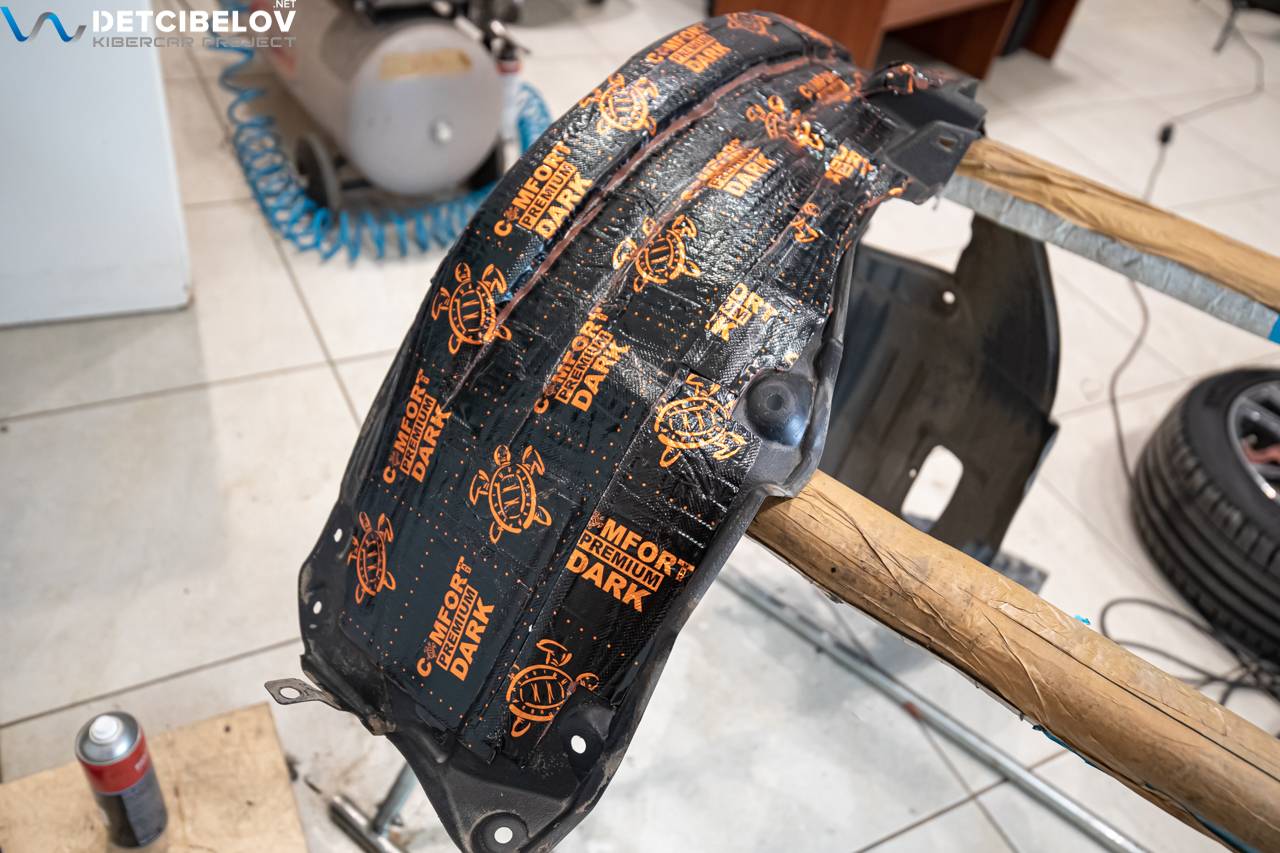 Третьим слоем укладываем Comfort mat Dark D3 Premium на подкрылки. Он создаст дополнительную защиту от вибрационных колебаний.