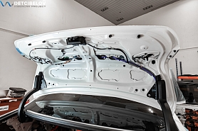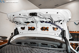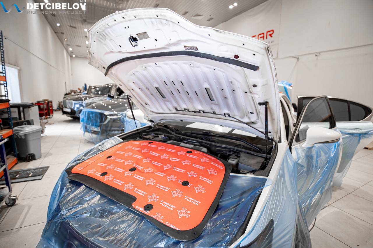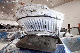 В работе с капотом на штатную шумотеплоизоляцию укладываем Comfort mat Fusion, сочетающий в себе свойства шумопоглотителя и акустической мембраны.