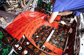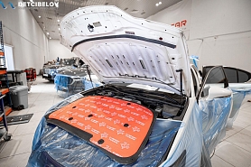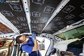 Команда выполняет расчеты, раскраивает материал и разогревает заготовки в специальной печи. Подогрев до 60-80 градусов помогает улучшить адгезию материала к поверхности, исключить образование складок и воздушных пузырей. Без подготовки качественная укладка этого вибродемпфера невозможна, такова цена качественной работы.
